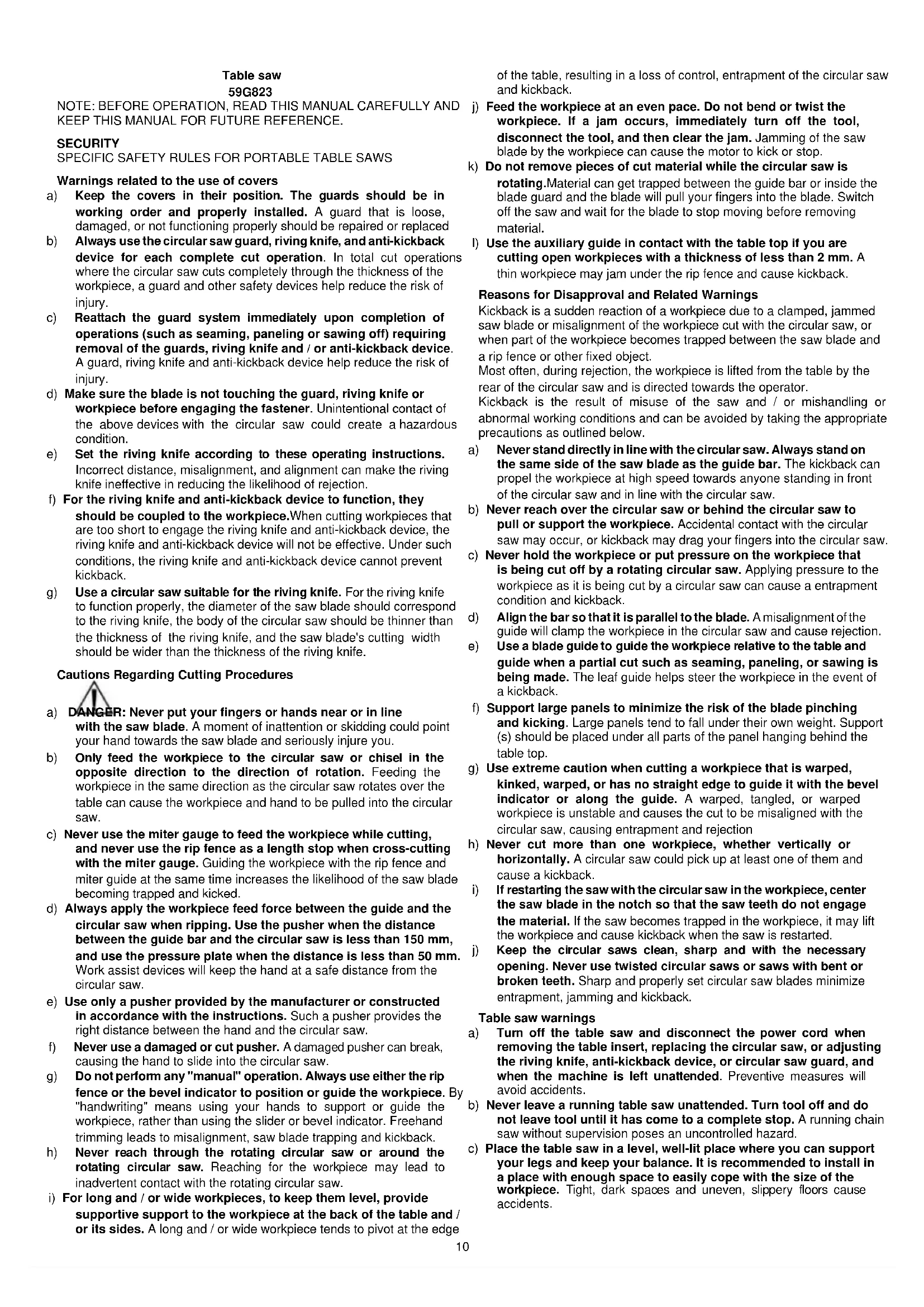 Original (manual) manual10 Table saw 59G823 NOTE: BEFORE OPERATION, READ THIS MANUAL CAREFULLY AND KEEP THIS MANUAL FOR FUTURE REFERENCE. SECURITY SPECIFIC SAFETY RULES FOR PORTABLE TABLE SAWS Warnings related to the use of covers a) Keep the covers in their position. The guards should be in working order and properly installed. A guard that is loose, damaged, or not functioning properly should be repaired or replaced b) Always use the circular saw guard, riving knife, and anti-kickback device for each complete cut operation. In total cut operations where the circular saw cuts completely through the thickness of the workpiece, a guard and other safety devices help reduce the risk of injury. c) Reattach the guard system immediately upon completion of operations (such as seaming, paneling or sawing off) requiring removal of the guards, riving knife and / or anti-kickback device. A guard, riving knife and anti-kickback device help reduce the risk of injury. d) Make sure the blade is not touching the guard, riving knife or workpiece before engaging the fastener. Unintentional contact of the above devices with the circular saw could create a hazardous condition. e) Set the riving knife according to these operating instructions. Incorrect distance, misalignment, and alignment can make the riving knife ineffective in reducing the likelihood of rejection. f) For the riving knife and anti-kickback device to function, they should be coupled to the workpiece.When cutting workpieces that are too short to engage the riving knife and anti-kickback device, the riving knife and anti-kickback device will not be effective. Under such conditions, the riving knife and anti-kickback device cannot prevent kickback. g) Use a circular saw suitable for the riving knife. For the riving knife to function properly, the diameter of the saw blade should correspond to the riving knife, the body of the circular saw should be thinner than the thickness of the riving knife, and the saw blade's cutting width should be wider than the thickness of the riving knife. Cautions Regarding Cutting Procedures a) DANGER: Never put your fingers or hands near or in line with the saw blade. A moment of inattention or skidding could point your hand towards the saw blade and seriously injure you. b) Only feed the workpiece to the circular saw or chisel in the opposite direction to the direction of rotation. Feeding the workpiece in the same direction as the circular saw rotates over the table can cause the workpiece and hand to be pulled into the circular saw. c) Never use the miter gauge to feed the workpiece while cutting, and never use the rip fence as a length stop when cross-cutting with the miter gauge. Guiding the workpiece with the rip fence and miter guide at the same time increases the likelihood of the saw blade becoming trapped and kicked. d) Always apply the workpiece feed force between the guide and the circular saw when ripping. Use the pusher when the distance between the guide bar and the circular saw is less than 150 mm, and use the pressure plate when the distance is less than 50 mm. Work assist devices will keep the hand at a safe distance from the circular saw. e) Use only a pusher provided by the manufacturer or constructed in accordance with the instructions. Such a pusher provides the right distance between the hand and the circular saw. f) Never use a damaged or cut pusher. A damaged pusher can break, causing the hand to slide into the circular saw. g) Do not perform any "manual" operation. Always use either the rip fence or the bevel indicator to position or guide the workpiece. By "handwriting" means using your hands to support or guide the workpiece, rather than using the slider or bevel indicator. Freehand trimming leads to misalignment, saw blade trapping and kickback. h) Never reach through the rotating circular saw or around the rotating circular saw. Reaching for the workpiece may lead to inadvertent contact with the rotating circular saw.