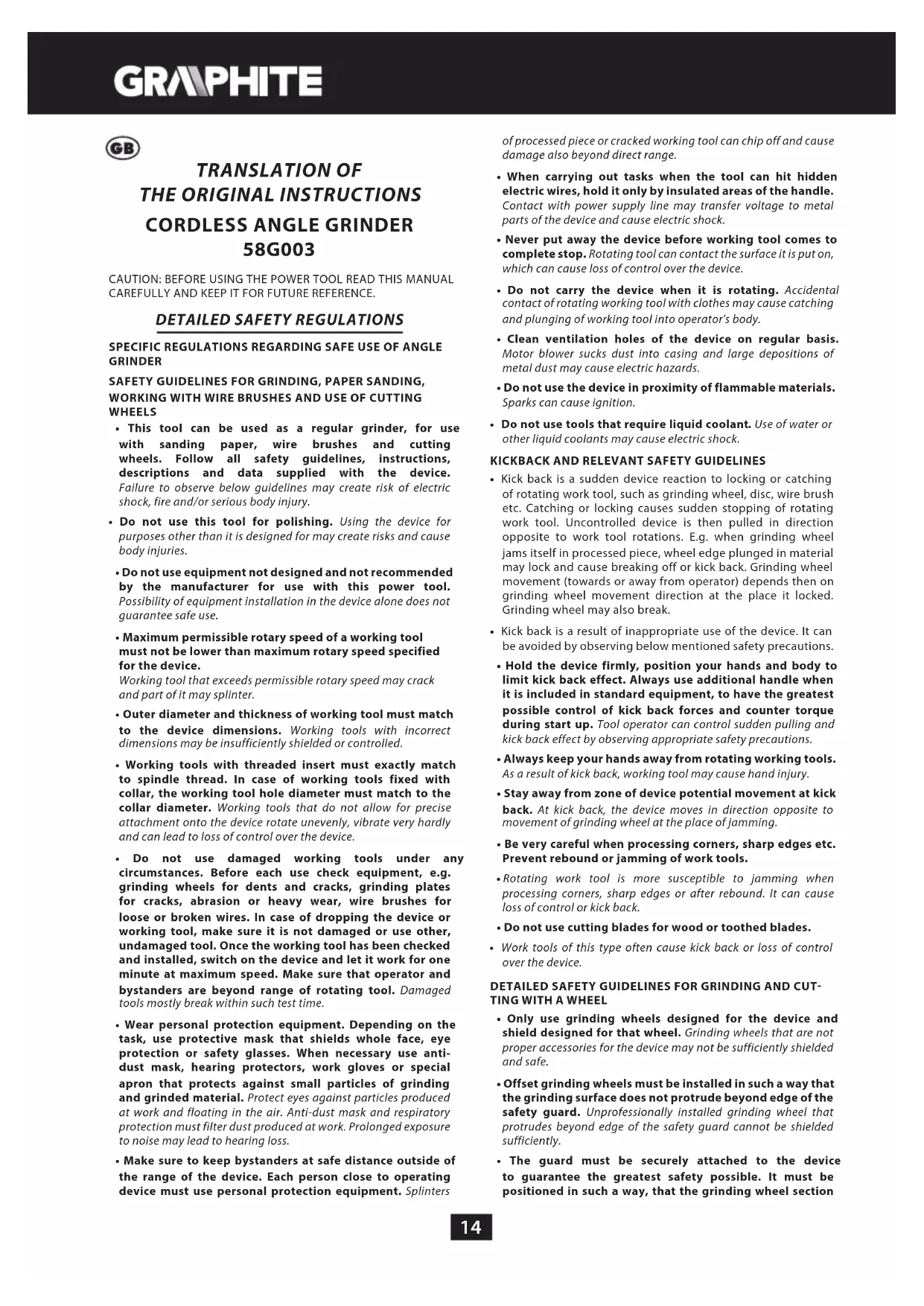 - Store the device with the battery removed. All defects should be repaired by service workshop authorized by the manufacturer.19 TECHNICAL PARAMETERS RATED PARAMETERS Cordless Angle Grinder Parameter Value Battery voltage 18 V DC Rated rotational speed 10000 rpm Maximum wheel diameter 115 mm Inner wheel diameter 22,2 mm Spindle thread M14 Protection class III Weight 1,5 kg Year of production 2018 Graphite Energy+ System Battery Parameter Value Battery 58G001 58G004 Battery voltage 18 V DC 18 V DC Battery type Li-Ion Li-Ion Battery capacity 2000 mAh 4000 mAh Ambient temperature range 4