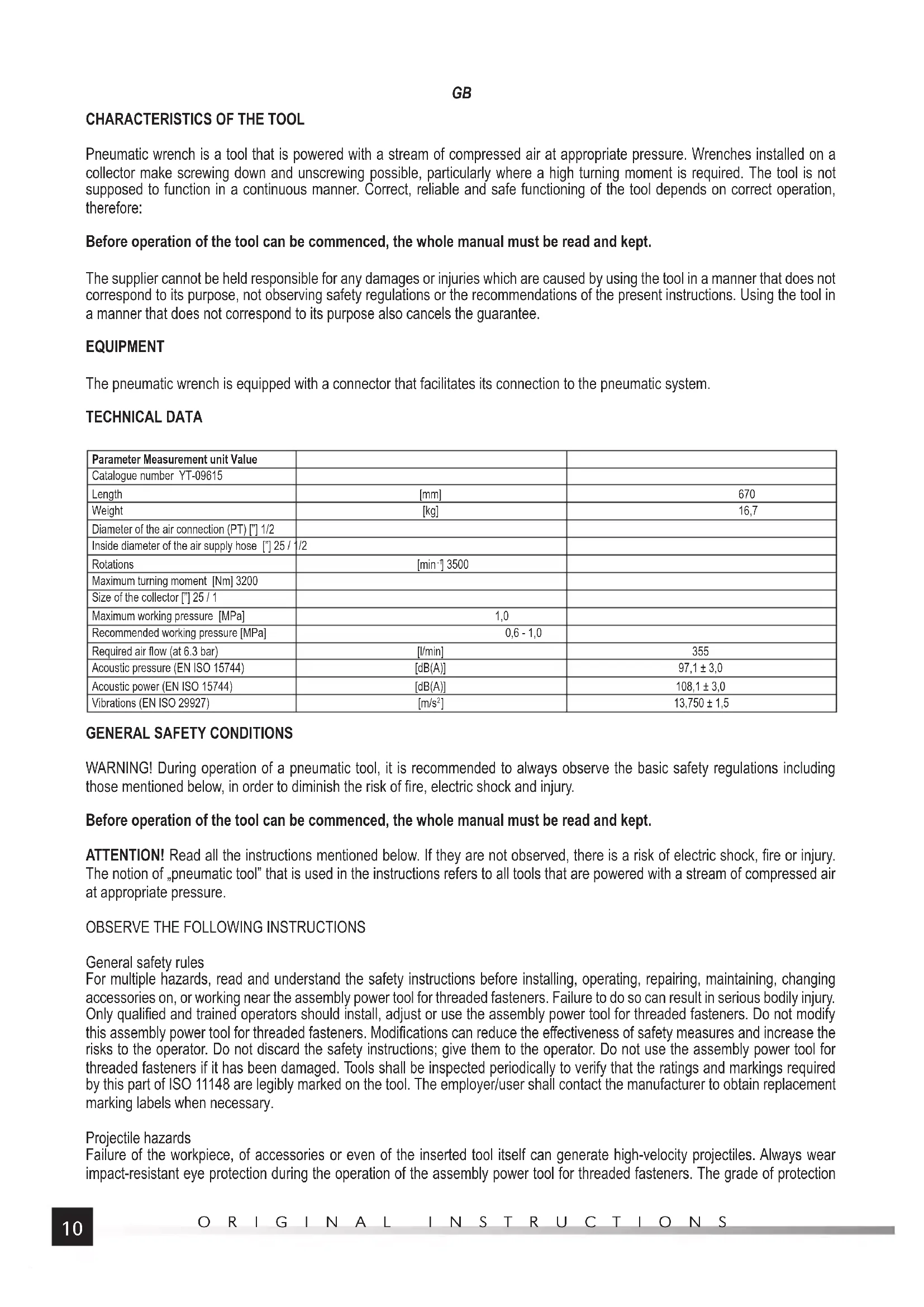 Pneumatic wrench is a tool that is powered with a stream of compressed air at appropriate pressure. Wrenches installed on a collector make screwing down and unscrewing possible, particularly where a high turning moment is required. The tool is not supposed to function in a continuous manner. Correct, reliable and safe functioning of the tool depends on correct operation, therefore: Before operation of the tool can be commenced, the whole manual must be read and kept. The supplier cannot be held responsible for any damages or injuries which are caused by using the tool in a manner that does not correspond to its purpose, not observing safety regulations or the recommendations of the present instructions. Using the tool in a manner that does not correspond to its purpose also cancels the guarantee. EQUIPMENT The pneumatic wrench is equipped with a connector that facilitates its connection to the pneumatic system. TECHNICAL DATA Parameter Measurement unit Value Catalogue number YT-09615 Length [mm] 670 Weight [kg] 16,7 Diameter of the air connection (PT) [”] 1/2 Inside diameter of the air supply hose [”] 25 / 1/2 Rotations [min