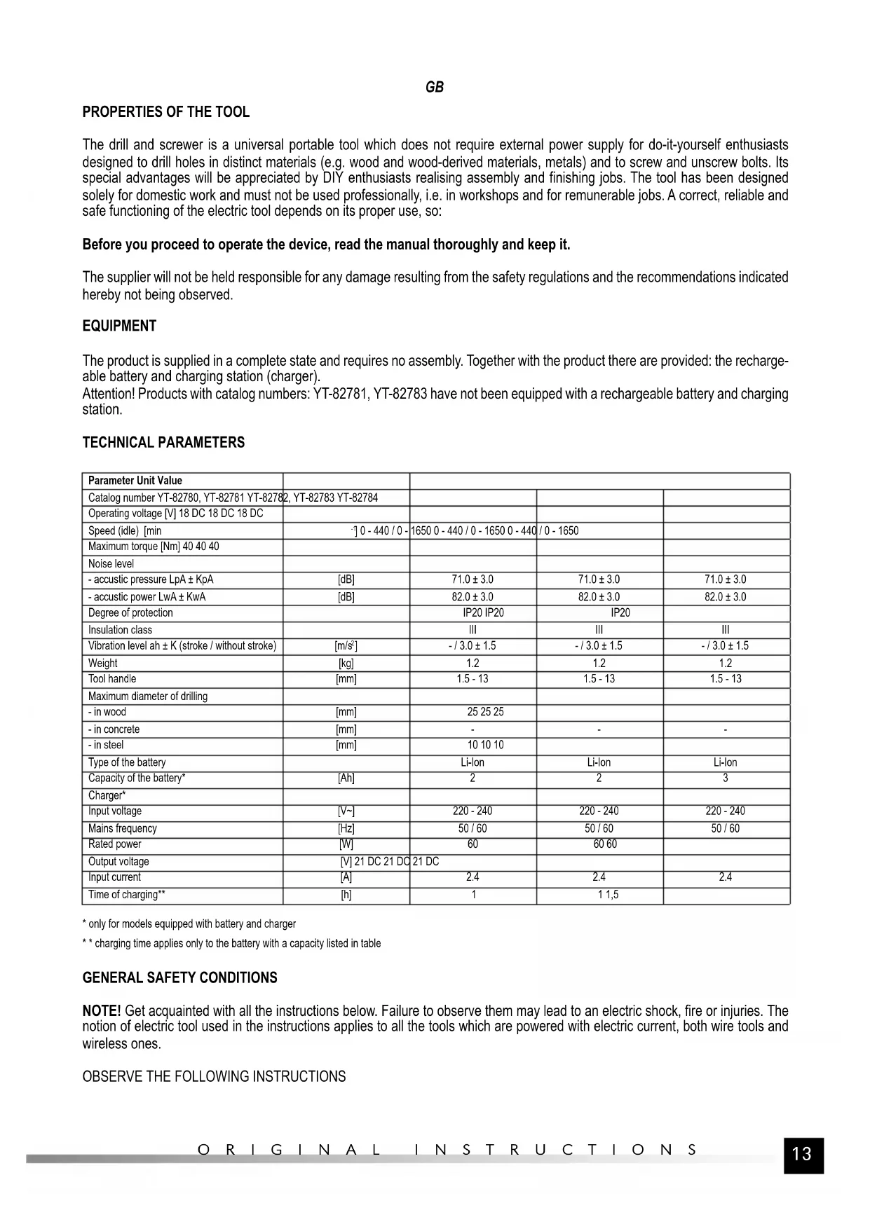 The drill and screwer is a universal portable tool which does not require external power supply for do-it-yourself enthusiasts designed to drill holes in distinct materials (e.g. wood and wood-derived materials, metals) and to screw and unscrew bolts. Its special advantages will be appreciated by DIY enthusiasts realising assembly and finishing jobs. The tool has been designed solely for domestic work and must not be used professionally, i.e. in workshops and for remunerable jobs. A correct, reliable and safe functioning of the electric tool depends on its proper use, so: Before you proceed to operate the device, read the manual thoroughly and keep it. The supplier will not be held responsible for any damage resulting from the safety regulations and the recommendations indicated hereby not being observed. EQUIPMENT The product is supplied in a complete state and requires no assembly. Together with the product there are provided: the recharge- able battery and charging station (charger). Attention! Products with catalog numbers: YT-82781, YT-82783 have not been equipped with a rechargeable battery and charging station. TECHNICAL PARAMETERS Parameter Unit Value Catalog number YT-82780, YT-82781 YT-82782, YT-82783 YT-82784 Operating voltage [V] 18 DC 18 DC 18 DC Speed (idle) [min