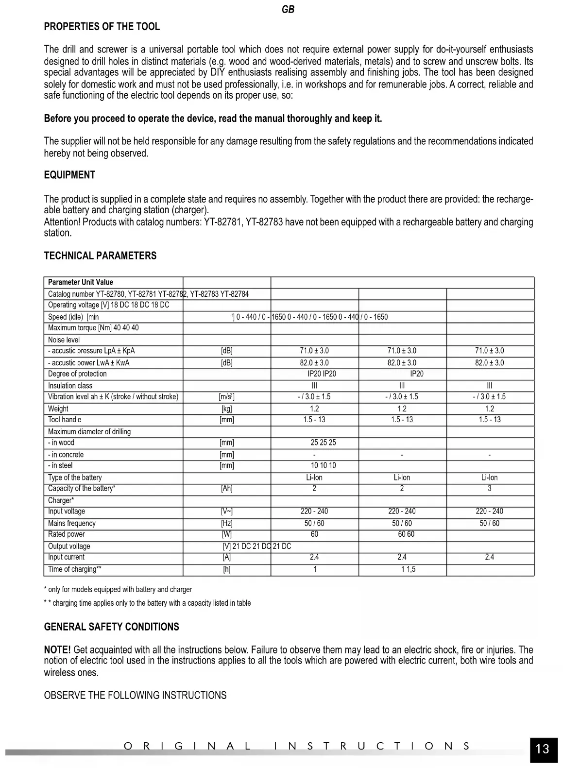 The drill and screwer is a universal portable tool which does not require external power supply for do-it-yourself enthusiasts designed to drill holes in distinct materials (e.g. wood and wood-derived materials, metals) and to screw and unscrew bolts. Its special advantages will be appreciated by DIY enthusiasts realising assembly and finishing jobs. The tool has been designed solely for domestic work and must not be used professionally, i.e. in workshops and for remunerable jobs. A correct, reliable and safe functioning of the electric tool depends on its proper use, so: Before you proceed to operate the device, read the manual thoroughly and keep it. The supplier will not be held responsible for any damage resulting from the safety regulations and the recommendations indicated hereby not being observed. EQUIPMENT The product is supplied in a complete state and requires no assembly. Together with the product there are provided: the recharge- able battery and charging station (charger). Attention! Products with catalog numbers: YT-82781, YT-82783 have not been equipped with a rechargeable battery and charging station. TECHNICAL PARAMETERS Parameter Unit Value Catalog number YT-82780, YT-82781 YT-82782, YT-82783 YT-82784 Operating voltage [V] 18 DC 18 DC 18 DC Speed (idle) [min