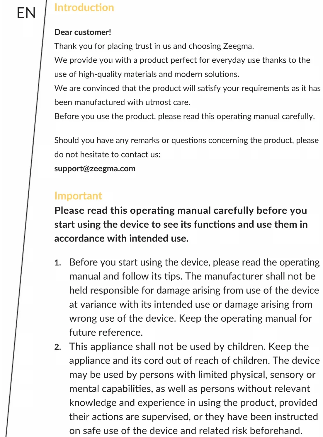 2EN Introducon Dear customer! Thank you for placing trust in us and choosing Zeegma. We provide you with a product perfect for everyday use thanks to the use of high-quality materials and modern soluons. We are convinced that the product will sasfy your requirements as it has been manufactured with utmost care. Before you use the product, please read this operang manual carefully. Should you have any remarks or quesons concerning the product, please do not hesitate to contact us: support@zeegma.com Important Please read this operang manual carefully before you start using the device to see its funcons and use them in accordance with intended use.