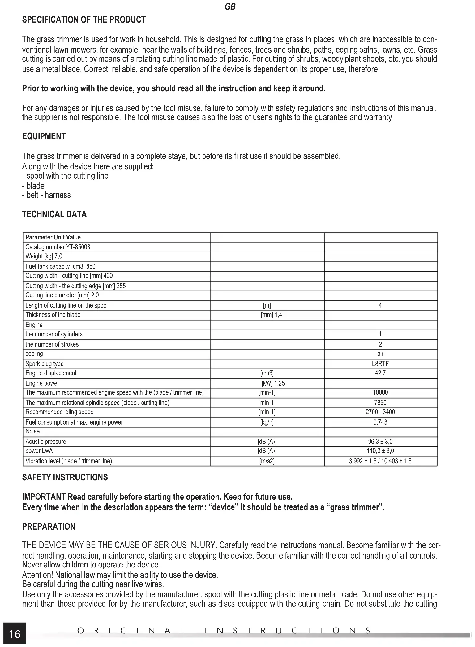 The grass trimmer is used for work in household. This is designed for cutting the grass in places, which are inaccessible to con- ventional lawn mowers, for example, near the walls of buildings, fences, trees and shrubs, paths, edging paths, lawns, etc. Grass cutting is carried out by means of a rotating cutting line made of plastic. For cutting of shrubs, woody plant shoots, etc. you should use a metal blade. Correct, reliable, and safe operation of the device is dependent on its proper use, therefore: Prior to working with the device, you should read all the instruction and keep it around. For any damages or injuries caused by the tool misuse, failure to comply with safety regulations and instructions of this manual, the supplier is not responsible. The tool misuse causes also the loss of user’s rights to the guarantee and warranty. EQUIPMENT The grass trimmer is delivered in a complete staye, but before its fi rst use it should be assembled. Along with the device there are supplied: - spool with the cutting line - blade - belt - harness TECHNICAL DATA Parameter Unit Value Catalog number YT-85003 Weight [kg] 7,0 Fuel tank capacity [cm3] 850 Cutting width - cutting line [mm] 430 Cutting width - the cutting edge [mm] 255 Cutting line diameter [mm] 2,0 Length of cutting line on the spool [m] 4 Thickness of the blade [mm] 1,4 Engine the number of cylinders 1 the number of strokes 2 cooling air Spark plug type L8RTF Engine displacement [cm3] 42,7 Engine power [kW] 1,25 The maximum recommended engine speed with the (blade / trimmer line) [min-1] 10000 The maximum rotational spindle speed (blade / cutting line) [min-1] 7850 Recommended idling speed [min-1] 2700 - 3400 Fuel consumption at max. engine power [kg/h] 0,743 Noise. Acustic pressure [dB (A)] 96,3 ± 3,0 power LwA [dB (A)] 110,3 ± 3,0 Vibration level (blade / trimmer line) [m/s2] 3,992 ± 1,5 / 10,403 ± 1,5 SAFETY INSTRUCTIONS IMPORTANT Read carefully before starting the operation. Keep for future use. Every time when in the description appears the term: “device” it should be treated as a “grass trimmer”. PREPARATION THE DEVICE MAY BE THE CAUSE OF SERIOUS INJURY. Carefully read the instructions manual. Become familiar with the cor- rect handling, operation, maintenance, starting and stopping the device. Become familiar with the correct handling of all controls. Never allow children to operate the device. Attention! National law may limit the ability to use the device. Be careful during the cutting near live wires. Use only the accessories provided by the manufacturer: spool with the cutting plastic line or metal blade. Do not use other equip- ment than those provided for by the manufacturer, such as discs equipped with the cutting chain. Do not substitute the cutting17 ORIGINAL INSTRUCTIONS