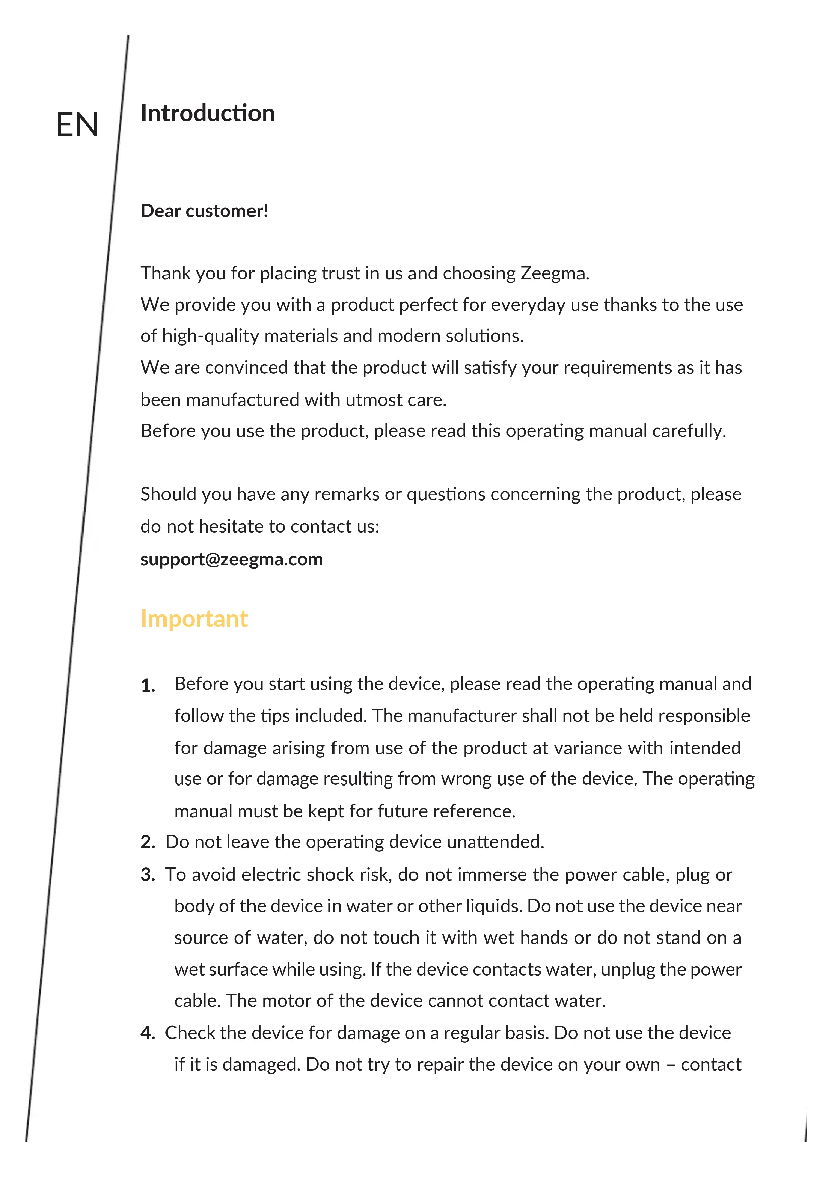 Grand Vitamine EN DE PL IT FR ES NL UK LT HR User manual Bedienungsanleitung Instrukcja obsługi Manuale d’uso Manuel de l’U lisateur Manual de usuario Handleiding Посібник користувача Vartotojo vadovas Korisnički priručnik Vartotojo vadovas Korisnički priručnik12 3 4EN Introducon Dear customer! Thank you for placing trust in us and choosing Zeegma. We provide you with a product perfect for everyday use thanks to the use of high-quality materials and modern soluons. We are convinced that the product will sasfy your requirements as it has been manufactured with utmost care. Before you use the product, please read this operang manual carefully. Should you have any remarks or quesons concerning the product, please do not hesitate to contact us: support@zeegma.com Important