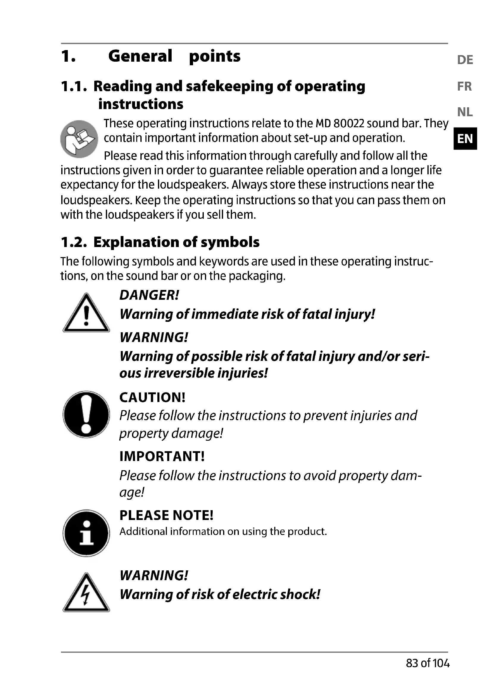 82 of 104 80022 DE-FR-NL-EN eCommerce Content RC1.indb 8280022 DE-FR-NL-EN eCommerce Content RC1.indb 82 31.07.2015 08:49:2131.07.2015 08:49:211. General points 1.1. Reading and safekeeping of operating instructions These operating instructions relate to the MD 80022 sound bar. They contain important information about set-up and operation. Please read this information through carefully and follow all the instructions given in order to guarantee reliable operation and a longer life expectancy for the loudspeakers. Always store these instructions near the loudspeakers. Keep the operating instructions so that you can pass them on with the loudspeakers if you sell them. 1.2. Explanation of symbols The following symbols and keywords are used in these operating instruc- tions, on the sound bar or on the packaging. DANGER! Warning of immediate risk of fatal injury! WARNING! Warning of possible risk of fatal injury and/or seri- ous irreversible injuries! CAUTION! Please follow the instructions to prevent injuries and property damage! IMPORTANT! Please follow the instructions to avoid property dam- age! PLEASE NOTE! Additional information on using the product. WARNING! Warning of risk of electric shock!