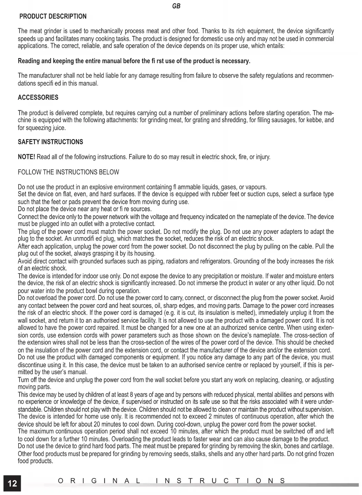 ORIGINAL INSTRUCTIONS PRODUCT DESCRIPTION The meat grinder is used to mechanically process meat and other food. Thanks to its rich equipment, the device signifi cantly speeds up and facilitates many cooking tasks. The product is designed for domestic use only and may not be used in commercial applications. The correct, reliable, and safe operation of the device depends on its proper use, which entails: Reading and keeping the entire manual before the fi rst use of the product is necessary. The manufacturer shall not be held liable for any damage resulting from failure to observe the safety regulations and recommen- dations specifi ed in this manual. ACCESSORIES The product is delivered complete, but requires carrying out a number of preliminary actions before starting operation. The ma- chine is equipped with the following attachments: for grinding meat, for grating and shredding, for fi lling sausages, for kebbe, and for squeezing juice. SAFETY INSTRUCTIONS NOTE! Read all of the following instructions. Failure to do so may result in electric shock, fi re, or injury.