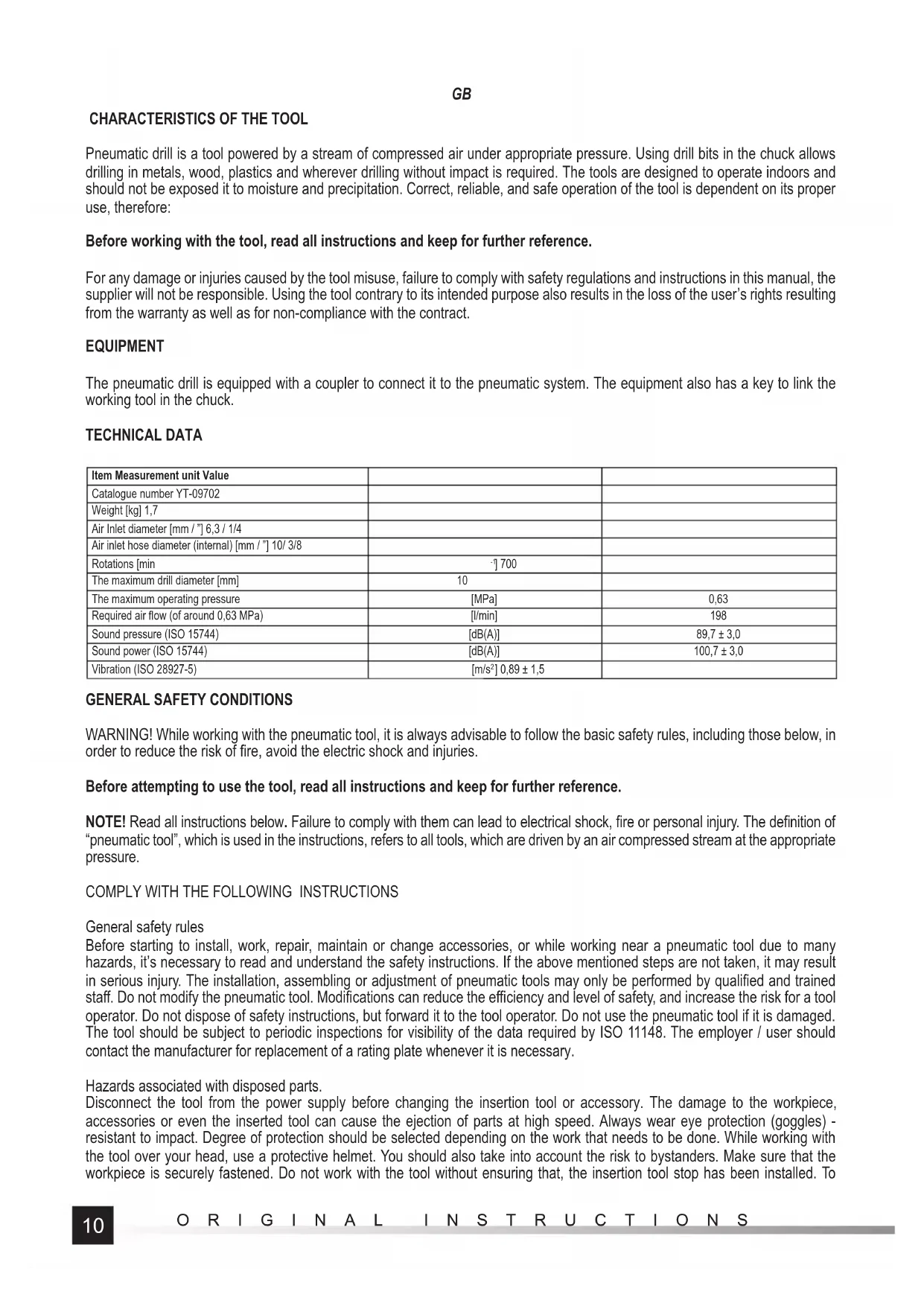 Pneumatic drill is a tool powered by a stream of compressed air under appropriate pressure. Using drill bits in the chuck allows drilling in metals, wood, plastics and wherever drilling without impact is required. The tools are designed to operate indoors and should not be exposed it to moisture and precipitation. Correct, reliable, and safe operation of the tool is dependent on its proper use, therefore: Before working with the tool, read all instructions and keep for further reference. For any damage or injuries caused by the tool misuse, failure to comply with safety regulations and instructions in this manual, the supplier will not be responsible. Using the tool contrary to its intended purpose also results in the loss of the user’s rights resulting from the warranty as well as for non-compliance with the contract. EQUIPMENT The pneumatic drill is equipped with a coupler to connect it to the pneumatic system. The equipment also has a key to link the working tool in the chuck. TECHNICAL DATA Item Measurement unit Value Catalogue number YT-09702 Weight [kg] 1,7 Air Inlet diameter [mm / ”] 6,3 / 1/4 Air inlet hose diameter (internal) [mm / ”] 10/ 3/8 Rotations [min