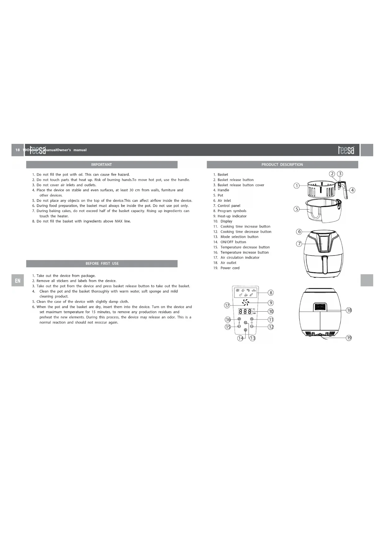 set maximum temperature for 15 minutes, to remove any production residues and preheat the new elements. During this process, the device may release an odor. This is a normal reaction and should not reoccur again. 18 19Owner’s manualOwner’s manual EN EN PRODUCT DESCRIPTION
