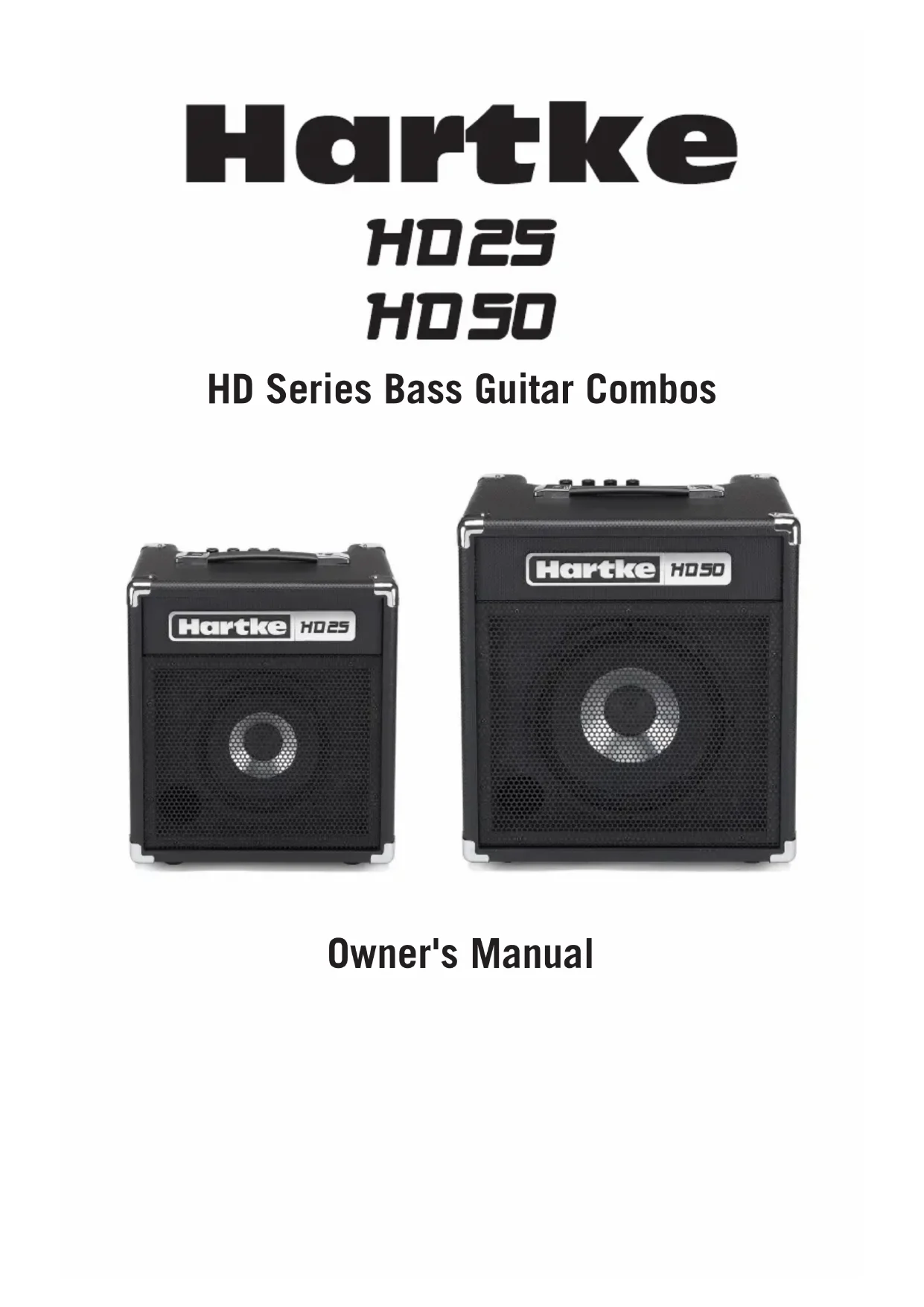 CD or MP3 player to play with prerecorded tracks. You can plug any line level signal into the AUX INPUT including the signal from a keyboard or drum machine. Connect the line level device to the AUX INPUT using standard 1/8” cable. You will need to use the volume control on the input device to set the balance between the track and your bass. So, start with the volume control all the way down and slowly raise it until you reach a good balance with your bass. Quick Start10 The Hartke HD Series Bass Amplifier gives you control over shaping the sound of your bass, using a process called equalization. To understand how this works, it’s important to know that every naturally occurring sound consists of a broad range of pitches, or frequencies, combined together in a unique way. This blend is what gives every sound its distinctive tonal color. The HD Series EQ controls allow you to alter a sound by boosting or attenuating specific frequency areas - they operate much like the bass and treble controls on your hi-fi amp, but with much greater precision. The HD25 and HD50 offer three bands of equalization. Each EQ knob, labeled Bass, Mid, and Treble, affects a different frequency area of the audio. We carefully selected these frequency areas because they have maximum impact on bass guitar signals. The Bass and Treble controls are shelving EQs, which provide boost when the control is moved clockwise from the center or cut when the control is moved counterclockwise from the center. The Mid EQ control is a passive, cut-only, circuit designed to provide a response that is flat to a mid-scoop. In many instances, the best way to deal with equalization is to think in terms of which frequency areas you need to attenuate, as opposed to which ones you need to boost. Be aware that boosting a frequency area also has the effect of boosting the overall signal; specifically, too much Low EQ boost can actually cause overload distortion or even harm the connected speaker. The specific EQ you will apply to your bass signal is very much dependent upon your particular instrument and personal taste and playing style. However, here are a few general suggestions: For reggae or Motown sound, boost the Bass EQ slightly while attenuating the Treble EQ. To remove boxiness and make your instrument sound more “hi-fi,” attenuate the Mid EQ control. For a twangy sound that cuts, try boosting the Treble and slighting rolling off the Bass EQ control. As you experiment with the EQ controls of the HD Series, don’t forget that your bass also provides significant EQ control in the form of its pickup and tonal settings—this can be particularly effective in instruments that have active circuitry. Using EqualizationHD Series Combos