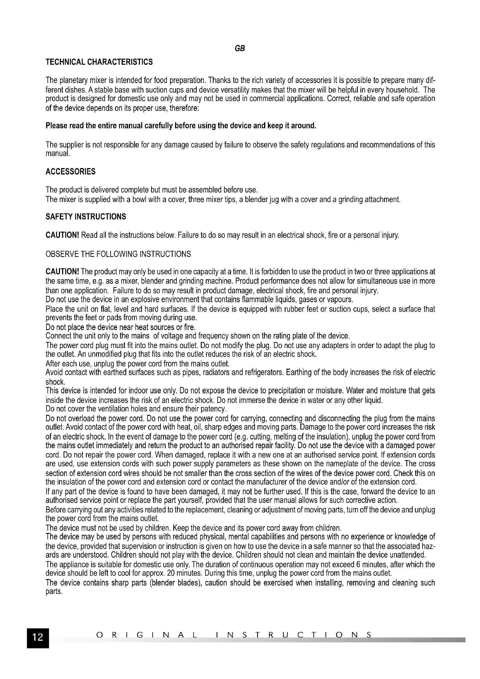 ORIGINAL INSTRUCTIONS TECHNICAL CHARACTERISTICS The planetary mixer is intended for food preparation. Thanks to the rich variety of accessories it is possible to prepare many dif- ferent dishes. A stable base with suction cups and device versatility makes that the mixer will be helpful in every household. The product is designed for domestic use only and may not be used in commercial applications. Correct, reliable and safe operation of the device depends on its proper use, therefore: Please read the entire manual carefully before using the device and keep it around. The supplier is not responsible for any damage caused by failure to observe the safety regulations and recommendations of this manual. ACCESSORIES The product is delivered complete but must be assembled before use. The mixer is supplied with a bowl with a cover, three mixer tips, a blender jug with a cover and a grinding attachment. SAFETY INSTRUCTIONS CAUTION! Read all the instructions below. Failure to do so may result in an electrical shock, fire or a personal injury.
