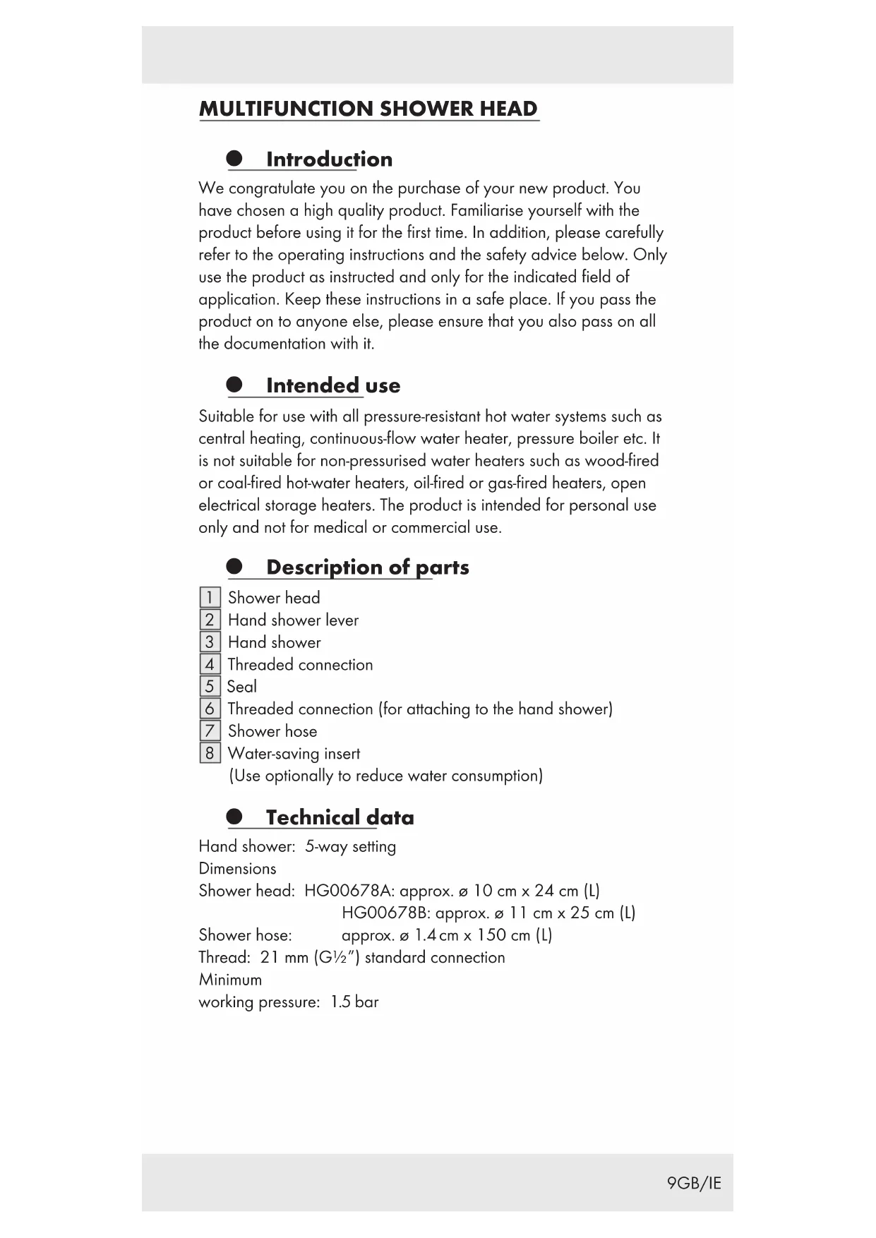 Water-saving insert (Use optionally to reduce water consumption) Technical data Hand shower: 5-way setting Dimensions Shower head: HG00678A: approx. ø 10cm x 24cm (L) HG00678B: approx. ø 11cm x 25cm (L) Shower hose: approx. ø 1.4 cm x 150cm (L) Thread: 21mm (G½”) standard connection Minimum working pressure: 1.5bar10 GB/IE Safety instructions KEEP ALL THE SAFETY ADVICE AND INSTRUCTIONS IN A SAFE PLACE FOR FUTURE REFERENCE!