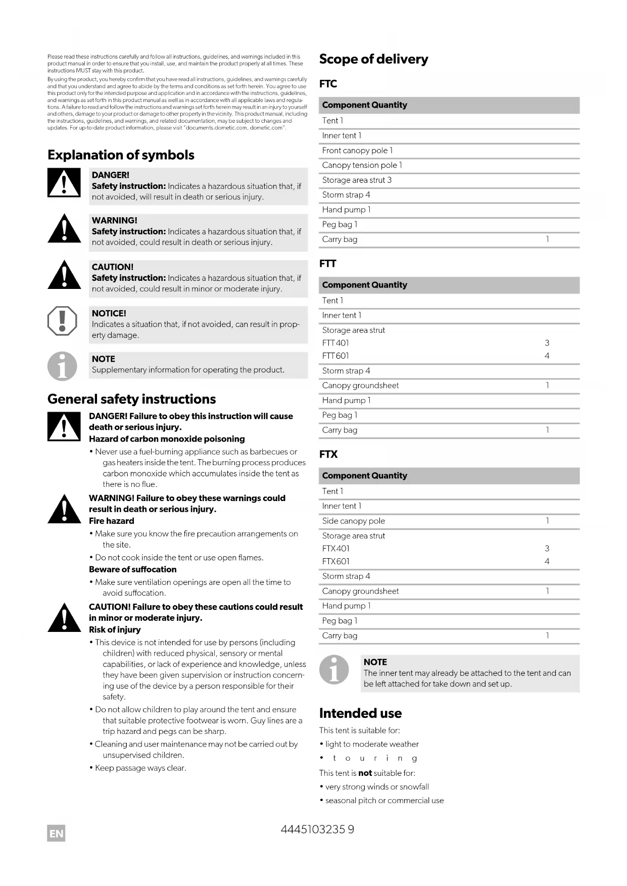 - seasonal pitch or commercial use DANGER! Safety instruction: Indicates a hazardous situation that, if not avoided, will result in death or serious injury. WARNING! Safety instruction: Indicates a hazardous situation that, if not avoided, could result in death or serious injury. CAUTION! Safety instruction: Indicates a hazardous situation that, if not avoided, could result in minor or moderate injury. NOTICE! Indicates a situation that, if not avoided, can result in prop- erty damage. NOTE Supplementary information for operating the product. Component Quantity Tent 1 Inner tent 1 Front canopy pole 1 Canopy tension pole 1 Storage area strut 3 Storm strap 4 Hand pump 1 Peg bag 1 Carry bag 1 Component Quantity Tent 1 Inner tent 1 Storage area strut FTT401 FTT601