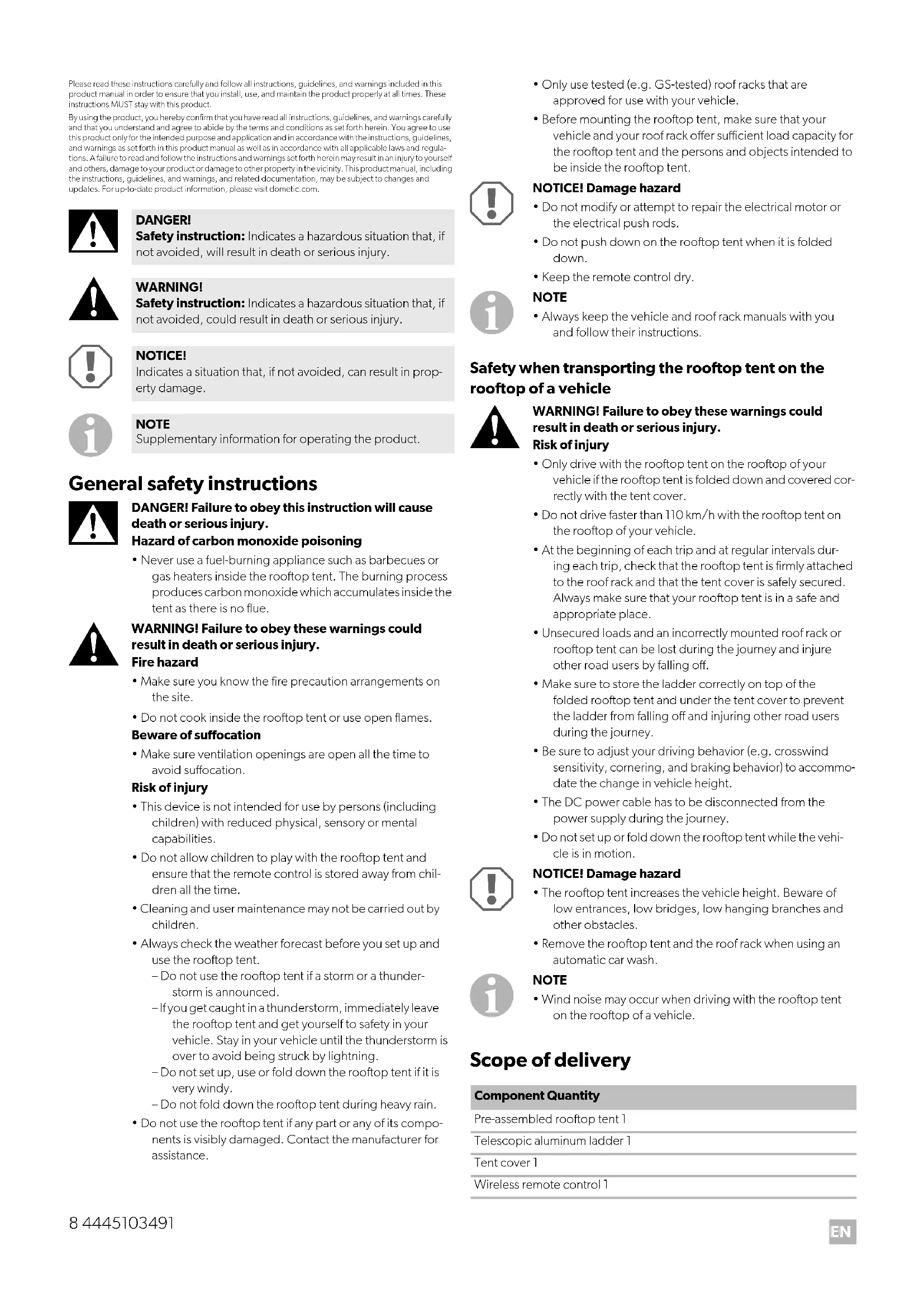 - Wind noise may occur when driving with the rooftop tent on the rooftop of a vehicle. Scope of delivery DANGER! Safety instruction: Indicates a hazardous situation that, if not avoided, will result in death or serious injury. WARNING! Safety instruction: Indicates a hazardous situation that, if not avoided, could result in death or serious injury. NOTICE! Indicates a situation that, if not avoided, can result in prop- erty damage. NOTE Supplementary information for operating the product. Component Quantity Pre-assembled rooftop tent 1 Telescopic aluminum ladder 1 Tent cover 1 Wireless remote control 1EN