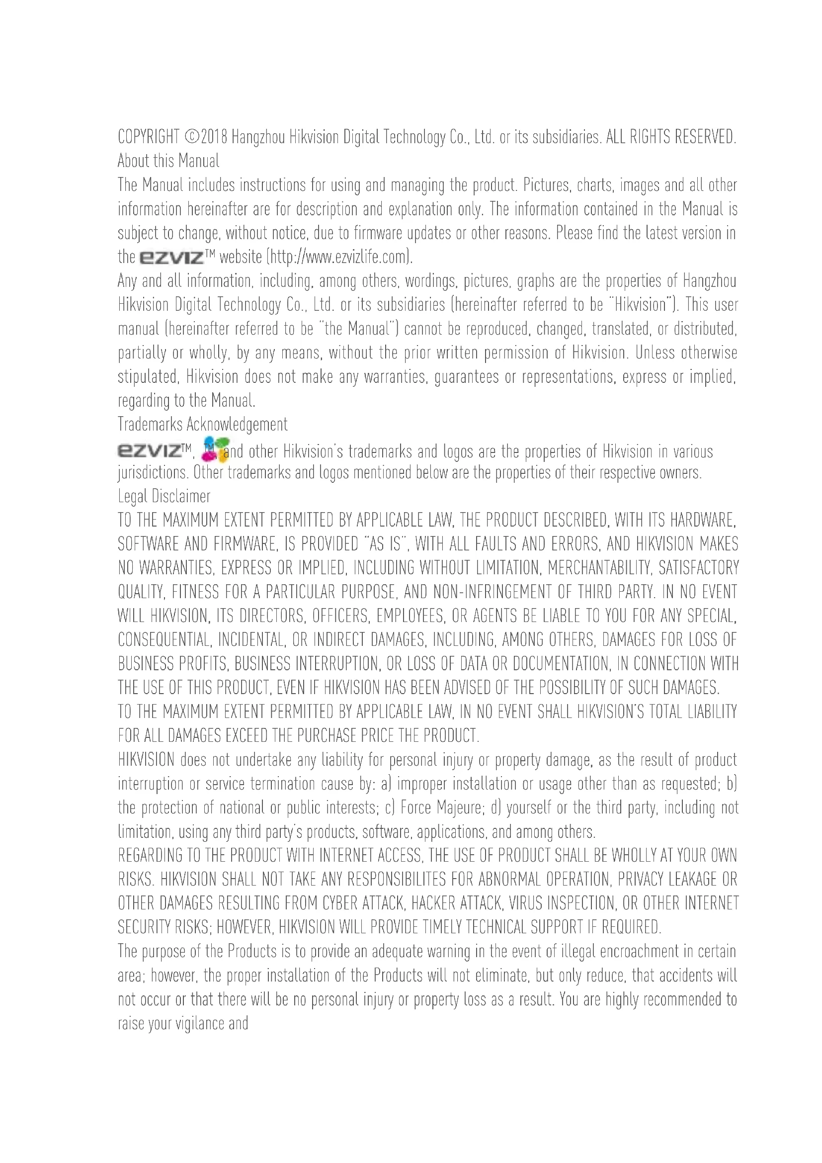 www.ezvizlife.comCOPYRIGHT ©2018 Hangzhou Hikvision Digital Technology Co., Ltd. or its subsidiaries. ALL RIGHTS RESERVED. About this Manual The Manual includes instructions for using and managing the product. Pictures, charts, images and all other information hereinafter are for description and explanation only. The information contained in the Manual is subject to change, without notice, due to firmware updates or other reasons. Please find the latest version in the ™ website (http://www.ezvizlife.com). Any and all information, including, among others, wordings, pictures, graphs are the properties of Hangzhou Hikvision Digital Technology Co., Ltd. or its subsidiaries (hereinafter referred to be “Hikvision”). This user manual (hereinafter referred to be “the Manual”) cannot be reproduced, changed, translated, or distributed, partially or wholly, by any means, without the prior written permission of Hikvision. Unless otherwise stipulated, Hikvision does not make any warranties, guarantees or representations, express or implied, regarding to the Manual. Trademarks Acknowledgement ™, ™, and other Hikvision’s trademarks and logos are the properties of Hikvision in various jurisdictions. Other trademarks and logos mentioned below are the properties of their respective owners. Legal Disclaimer TO THE MAXIMUM EXTENT PERMITTED BY APPLICABLE LAW, THE PRODUCT DESCRIBED, WITH ITS HARDWARE, SOFTWARE AND FIRMWARE, IS PROVIDED “AS IS”, WITH ALL FAULTS AND ERRORS, AND HIKVISION MAKES NO WARRANTIES, EXPRESS OR IMPLIED, INCLUDING WITHOUT LIMITATION, MERCHANTABILITY, SATISFACTORY QUALITY, FITNESS FOR A PARTICULAR PURPOSE, AND NON-INFRINGEMENT OF THIRD PARTY. IN NO EVENT WILL HIKVISION, ITS DIRECTORS, OFFICERS, EMPLOYEES, OR AGENTS BE LIABLE TO YOU FOR ANY SPECIAL, CONSEQUENTIAL, INCIDENTAL, OR INDIRECT DAMAGES, INCLUDING, AMONG OTHERS, DAMAGES FOR LOSS OF BUSINESS PROFITS, BUSINESS INTERRUPTION, OR LOSS OF DATA OR DOCUMENTATION, IN CONNECTION WITH THE USE OF THIS PRODUCT, EVEN IF HIKVISION HAS BEEN ADVISED OF THE POSSIBILITY OF SUCH DAMAGES. TO THE MAXIMUM EXTENT PERMITTED BY APPLICABLE LAW, IN NO EVENT SHALL HIKVISION’S TOTAL LIABILITY FOR ALL DAMAGES EXCEED THE PURCHASE PRICE THE PRODUCT. HIKVISION does not undertake any liability for personal injury or property damage, as the result of product interruption or service termination cause by: a) improper installation or usage other than as requested; b) the protection of national or public interests; c) Force Majeure; d) yourself or the third party, including not limitation, using any third party’s products, software, applications, and among others. REGARDING TO THE PRODUCT WITH INTERNET ACCESS, THE USE OF PRODUCT SHALL BE WHOLLY AT YOUR OWN RISKS. HIKVISION SHALL NOT TAKE ANY RESPONSIBILITES FOR ABNORMAL OPERATION, PRIVACY LEAKAGE OR OTHER DAMAGES RESULTING FROM CYBER ATTACK, HACKER ATTACK, VIRUS INSPECTION, OR OTHER INTERNET SECURITY RISKS; HOWEVER, HIKVISION WILL PROVIDE TIMELY TECHNICAL SUPPORT IF REQUIRED. The purpose of the Products is to provide an adequate warning in the event of illegal encroachment in certain area; however, the proper installation of the Products will not eliminate, but only reduce, that accidents will not occur or that there will be no personal injury or property loss as a result. You are highly recommended to raise your vigilance andstrengthen the safety awareness in the daily life. SURVEILLANCE LAWS VARY BY JURISDICTION. PLEASE CHECK ALL RELEVANT LAWS IN YOUR JURISDICTION BEFORE USING THIS PRODUCT IN ORDER TO ENSURE THAT YOUR USE CONFORMS TO THE APPLICABLE LAW. YOU FUTHER AGREE THAT THIS PRODUCT IS ONLY FOR CIVIL USE, AND HIKVISION SHALL NOT BE LIABLE IN THE EVENT THAT THIS PRODUCT IS USED WITH ILLEGITIMATE PURPOSES, SUCH AS THIRD PARTY RIGHTS INFRINGEMENT, MEDICAL TREATMENT, SAFETY EQUIPMENT OR OTHER SITUATIONS WHERE THE PRODUCT FAILURE COULD LEAD TO DEATH OR PERSONAL INJURY, OR WEAPON OF MASS DESTRUCTION, CHEMINCAL AND BIOLOGICAL WEAPON, NUCLEAR EXPLOSION, AND ANY UNSAFE NUCLEAR ENERGY USES OR ANTI-HUMANITY USAGES. YOU SHOULD UNDERTAKE ALL RESPONSIBILITIES FOR LOSSES OR DAMAGES RESULTING FROM THE ABOVE USAGES WHATSOEVER. IN THE EVENT OF ANY CONFLICTS BETWEEN THE ABOVE AND THE APPLICABLE LAW, THE LATER PREVAILS. Regulatory Information FCC Information This device complies with Part 15 of the FCC Rules. Operation is subject to the following two conditions: (1) This device may not cause harmful interference, and (2) This device must accept any interference received, including interference that may cause undesired operation. Note: This product has been tested and found to comply with the limits for a Class B digital device, pursuant to Part 15 of the FCC Rules. These limits are designed to provide reasonable protection against harmful interference in a residential installation. This product generates, uses, and can radiate radio frequency energy and, if not installed and used in accordance with the instructions, may cause harmful interference to radio communications. However, there is no guarantee that interference will not occur in a particular installation. If this product does cause harmful interference to radio or television reception, which can be determined by turning the equipment off and on, the user is encouraged to try to correct the interference by one or more of the following measures: —Reorient or relocate the receiving antenna. —Increase the separation between the equipment and receiver. —Connect the equipment into an outlet on a circuit different from that to which the receiver is connected. —Consult the dealer or an experienced radio/TV technician for help. Please take attention that changes or modification not expressly approved by the party responsible for compliance could void the user’s authority to operate the equipment. This equipment should be installed and operated with a minimum distance 20cm between the radiator and your body. This device complies with Industry Canada 