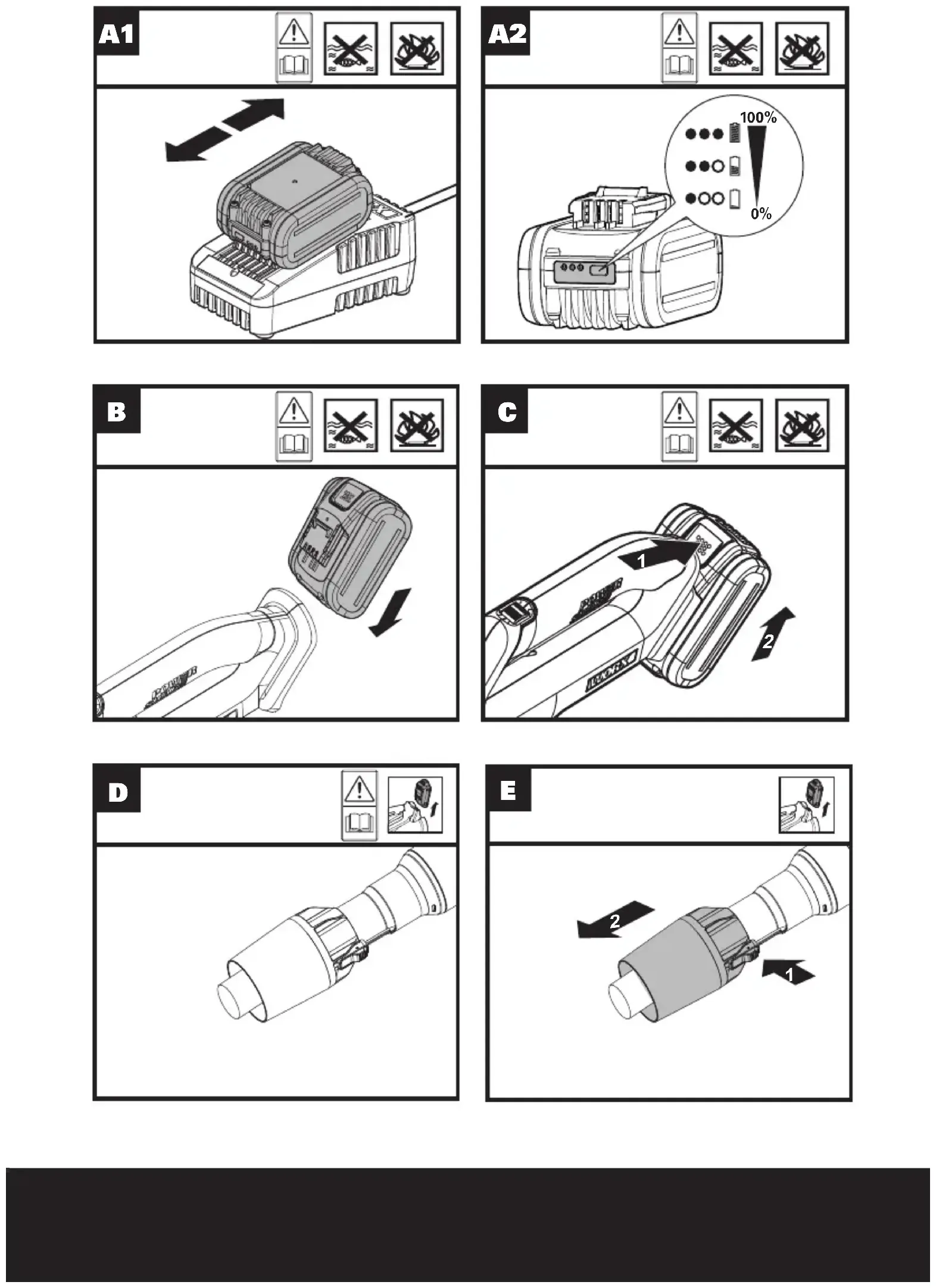 ARNING! The charger and battery pack are specially designed to work together, so do not attempt to use any other devices. Never insert or allow metallic objects into your charger or battery pack connections because of an electrical failure and hazard will occur. See Fig. A1, A2 Installing & removing the battery pack NOTE: Press the battery release button to release battery pack from your tool. After recharging, insert the battery pack into tool’s battery port. A simple push and slight pressure will be sufficient. See Fig. B, C Air speed mode NOTE: The blower is in the air speed mode for default assembly. NOTE: The blower has two working modes: air speed mode and air volume mode. To change modes, depress the nozzle release button and slide backward for air speed mode. Slide forward for air volume mode. Choose a suitable mode according to your work. Air speed mode is recommended for cleaning in grass, as shown in Fig. H1. While air volume mode is recommended for cleaning on hard ground such as cement, as shown in Fig. H2. See Fig. D12 20V Akku-Laubblasgerät