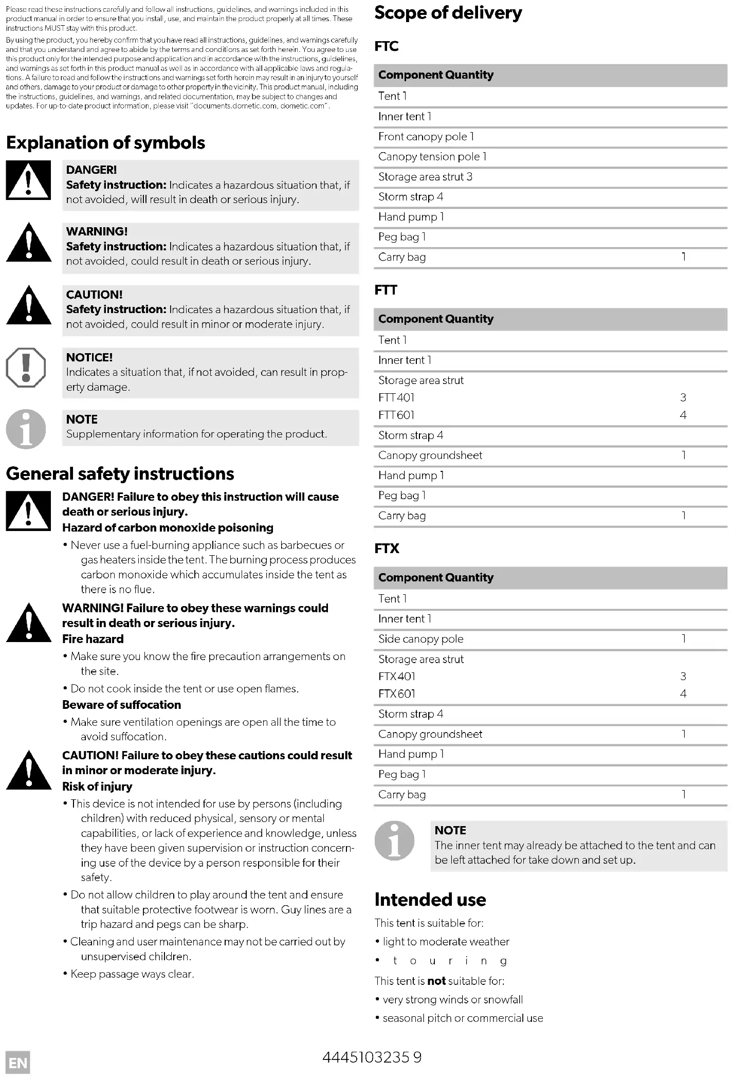 - seasonal pitch or commercial use DANGER! Safety instruction: Indicates a hazardous situation that, if not avoided, will result in death or serious injury. WARNING! Safety instruction: Indicates a hazardous situation that, if not avoided, could result in death or serious injury. CAUTION! Safety instruction: Indicates a hazardous situation that, if not avoided, could result in minor or moderate injury. NOTICE! Indicates a situation that, if not avoided, can result in prop- erty damage. NOTE Supplementary information for operating the product. Component Quantity Tent 1 Inner tent 1 Front canopy pole 1 Canopy tension pole 1 Storage area strut 3 Storm strap 4 Hand pump 1 Peg bag 1 Carry bag 1 Component Quantity Tent 1 Inner tent 1 Storage area strut FTT401 FTT601