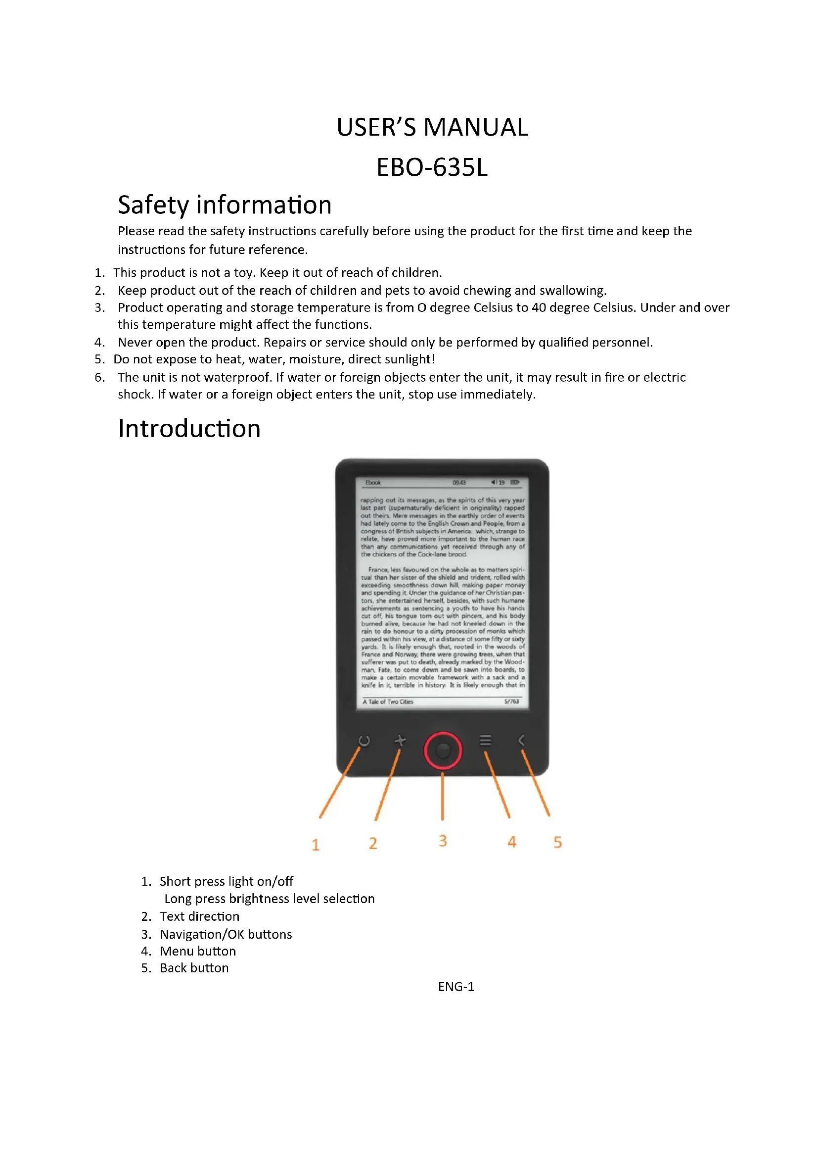 ENG-44.Language setting In order to change the language, go to Settings and select Language. A pop up window with available languages will appear. Choose the appropriate language and press the “OK” button to confirm. 5.Format device The user can format the device in this tab. Please keep in mind that during formatting, all data saved on the internal memory will be deleted! Back up your important data! We suggest to remove the memory card from the device before formatting it. 6.Default settings In order to restore the reader's default settings, enter this tab, select OK and press the “OK” button to confirm. The default settings will be restored, and a language selection prompt will be displayed on the screen. Device information. Enter this tab to display software version, device model number, used and total capacity of the internal memory as well as used and total capacity of the external memory. 7.Device information Enter this tab to display software version, device model number, used and total capacity of the internal memory as well as used and total capacity of the external memory. Data transfer There are two ways to transfer files: 1.Insert a microSD card with preloaded files into the device's memory slot. 2.Connect the reader to a PC with the USB cable provided. A prompt indicating successful USB connection will be displayed on the screen. You may now copy files to the device or memory card. Note: Do not disconnect the reader from the computer during data transfer, as you could damage the device's memory. Reset In case of the reader being e.g. frozen, the user can reset the device. Insert a thin tool into the reset hole at the back of the device, and press and hold the button to restart the device. Transfering DRM copy protected Ebooks to your