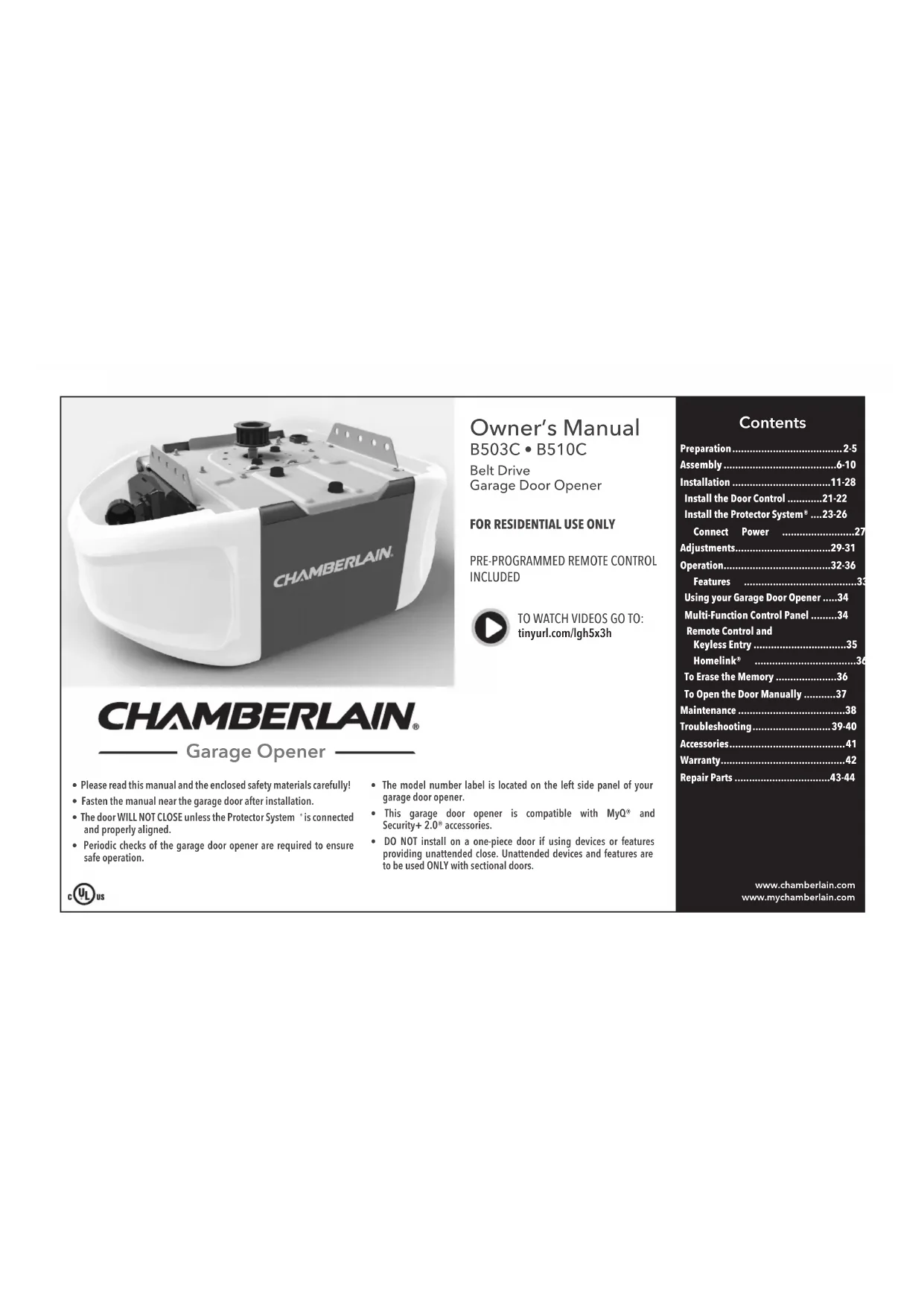 - INCLUDED www.chamberlain.comwww.mychamberlain.com• Please read this manual and the enclosed safety materials carefully!• Fasten the manual near the garage door after installation.• The door WILL NOT CLOSE unless the Protector System is connected and properly aligned.• Periodic checks of the garage door opener are required to ensure safe operation.• The model number label is located on the left side panel of your garage door opener.• This garage door opener is compatible with MyQ® and Security+b2.0® accessories.• DO NOT install on a one-piece door if using devices or features providing unattended close. Unattended devices and features are to be used ONLY with sectional doors. Garage Opener Preparation p. 2