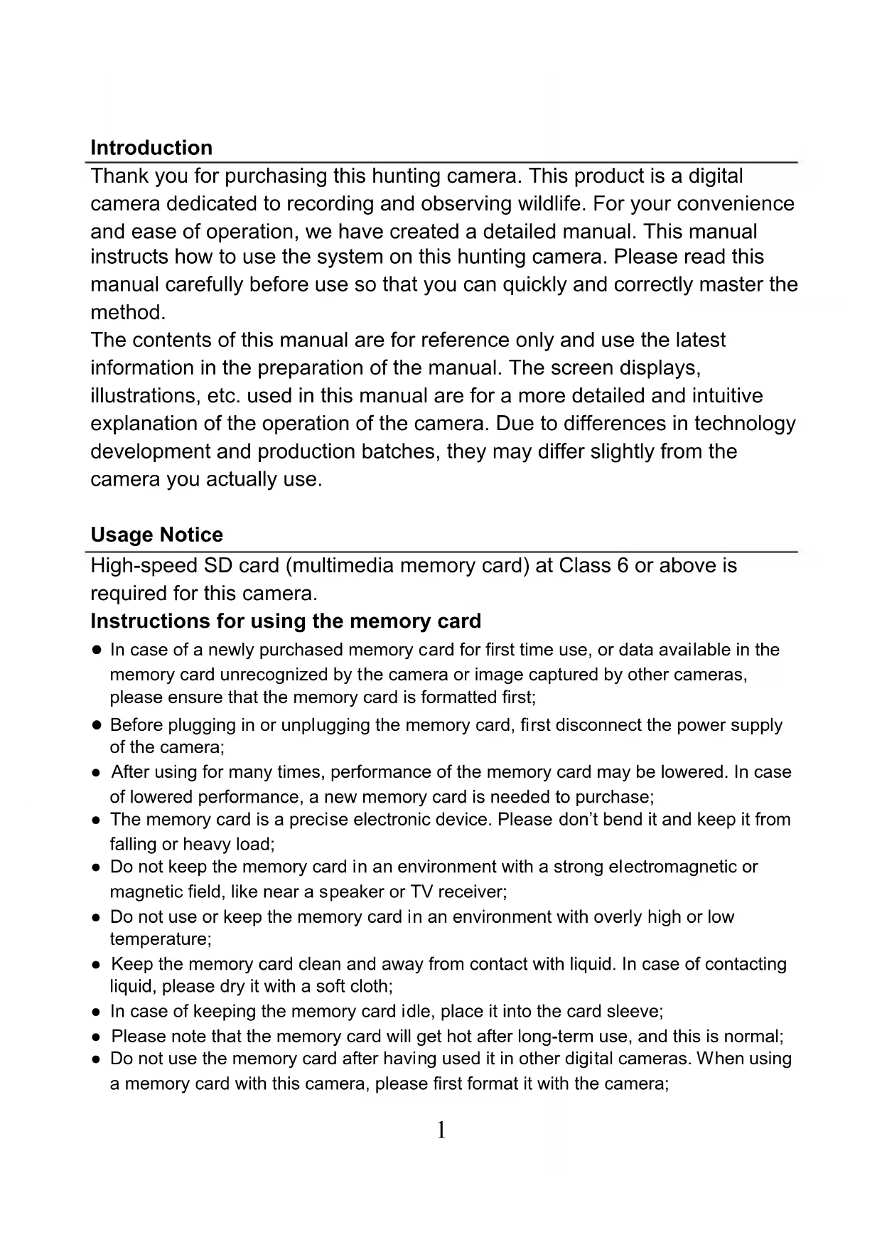 Hinweis: Änderung der technischen Daten aufgrund von Aktualisierungen vorbehalten. Betrachten Sie das aktuelle Produkt als Standardprodukt.User Manual ScoutingCam BLACK800 WiFi1 Introduction Thank you for purchasing this hunting camera. This product is a digital camera dedicated to recording and observing wildlife. For your convenience and ease of operation, we have created a detailed manual. This manual instructs how to use the system on this hunting camera. Please read this manual carefully before use so that you can quickly and correctly master the method. The contents of this manual are for reference only and use the latest information in the preparation of the manual. The screen displays, illustrations, etc. used in this manual are for a more detailed and intuitive explanation of the operation of the camera. Due to differences in technology development and production batches, they may differ slightly from the camera you actually use. Usage Notice High-speed SD card (multimedia memory card) at Class 6 or above is required for this camera. Instructions for using the memory card ● In case of a newly purchased memory card for first time use, or data available in the memory card unrecognized by the camera or image captured by other cameras, please ensure that the memory card is formatted first; ● Before plugging in or unplugging the memory card, first disconnect the power supply of the camera; ● After using for many times, performance of the memory card may be lowered. In case of lowered performance, a new memory card is needed to purchase; ● The memory card is a precise electronic device. Please don’t bend it and keep it from falling or heavy load; ● Do not keep the memory card in an environment with a strong electromagnetic or magnetic field, like near a speaker or TV receiver; ● Do not use or keep the memory card in an environment with overly high or low temperature; ● Keep the memory card clean and away from contact with liquid. In case of contacting liquid, please dry it with a soft cloth; ● In case of keeping the memory card idle, place it into the card sleeve; ● Please note that the memory card will get hot after long-term use, and this is normal; ● Do not use the memory card after having used it in other digital cameras. When using a memory card with this camera, please first format it with the camera;2 ● Do not use the memory card having formatted on another camera or card reader; ● In case of one of the following actions with the memory card, the recorded data may be damaged: - Improper use of the memory card. - Disconnecting the power supply or removing the memory card during recording, deleting (formatting) or reading. Appearance Appearance