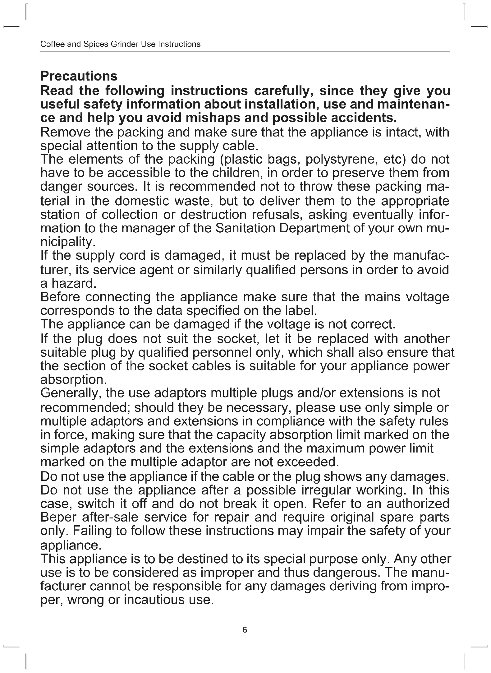 Precautions Read the following instructions carefully, since they give you useful safety information about installation, use and maintenan- ce and help you avoid mishaps and possible accidents. Remove the packing and make sure that the appliance is intact, with special attention to the supply cable. The elements of the packing (plastic bags, polystyrene, etc) do not have to be accessible to the children, in order to preserve them from danger sources. It is recommended not to throw these packing ma- terial in the domestic waste, but to deliver them to the appropriate station of collection or destruction refusals, asking eventually infor- mation to the manager of the Sanitation Department of your own mu- nicipality. If the supply cord is damaged, it must be replaced by the manufac- turer, its service agent or similarly qualied persons in order to avoid a hazard. Before connecting the appliance make sure that the mains voltage corresponds to the data specied on the label. The appliance can be damaged if the voltage is not correct. If the plug does not suit the socket, let it be replaced with another suitable plug by qualied personnel only, which shall also ensure that the section of the socket cables is suitable for your appliance power absorption. Generally, the use adaptors multiple plugs and/or extensions is not recommended; should they be necessary, please use only simple or multiple adaptors and extensions in compliance with the safety rules in force, making sure that the capacity absorption limit marked on the simple adaptors and the extensions and the maximum power limit marked on the multiple adaptor are not exceeded. Do not use the appliance if the cable or the plug shows any damages. Do not use the appliance after a possible irregular working. In this case, switch it off and do not break it open. Refer to an authorized Beper after-sale service for repair and require original spare parts only. Failing to follow these instructions may impair the safety of your appliance. This appliance is to be destined to its special purpose only. Any other use is to be considered as improper and thus dangerous. The manu- facturer cannot be responsible for any damages deriving from impro- per, wrong or incautious use.EN Coffee and Spices Grinder Use Instructions