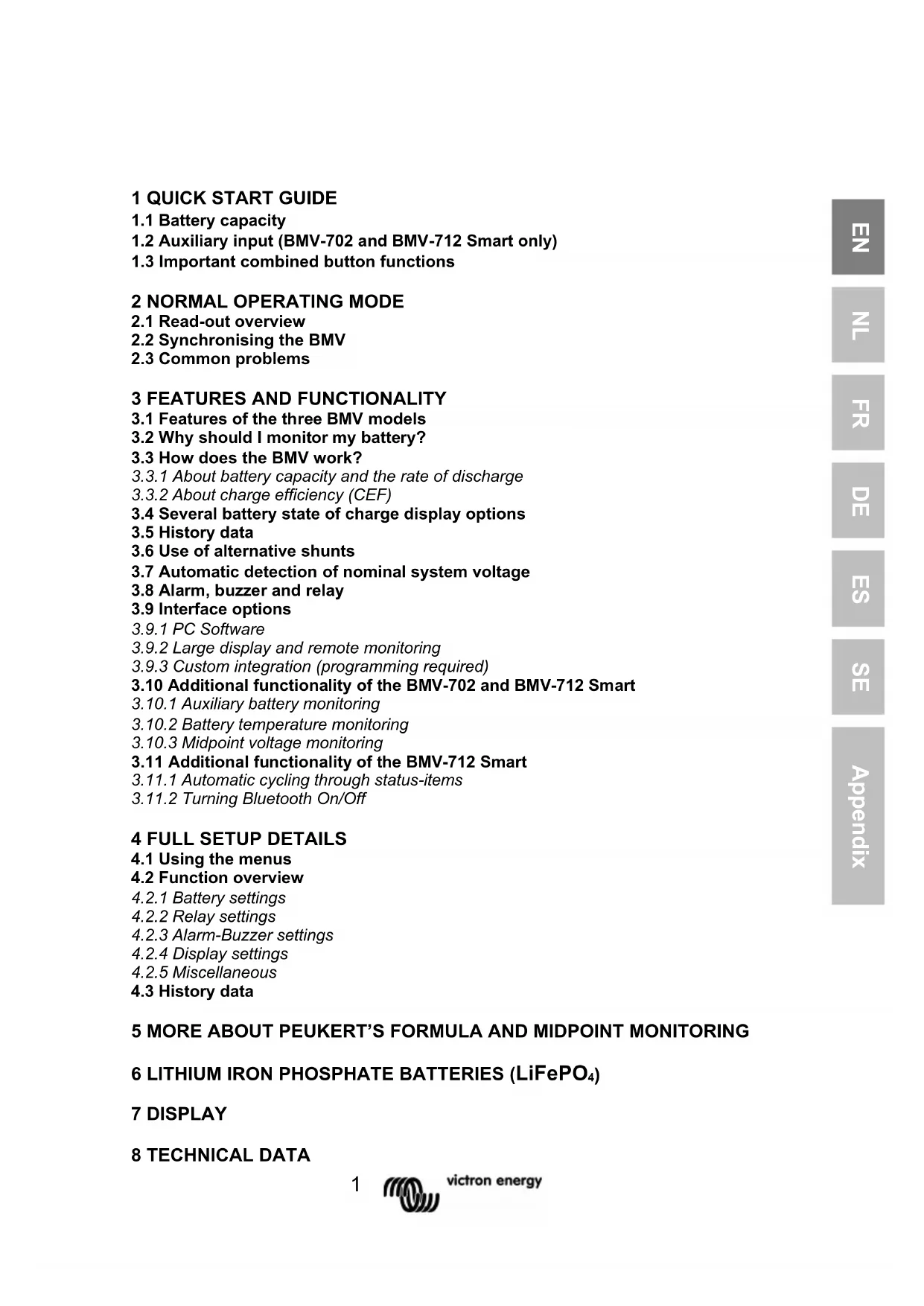 Batteries are used in a wide variety of applications, mostly to store energy for later use. But how much energy is stored in the battery? No one can tell by just looking at it.13 NL FR DE ES SE IT PT EN NL FR DE ES SE Appendix The service life of batteries depends on many factors. Battery life may be shortened by undercharging, overcharging, excessively deep discharges, excessive charge or discharge current, and high ambient temperature. By monitoring the battery with an advanced battery monitor, important feedback is given to the user so that remedial measures can be taken when necessary. Doing this, which extends battery life, the BMV will quickly pay for itself.