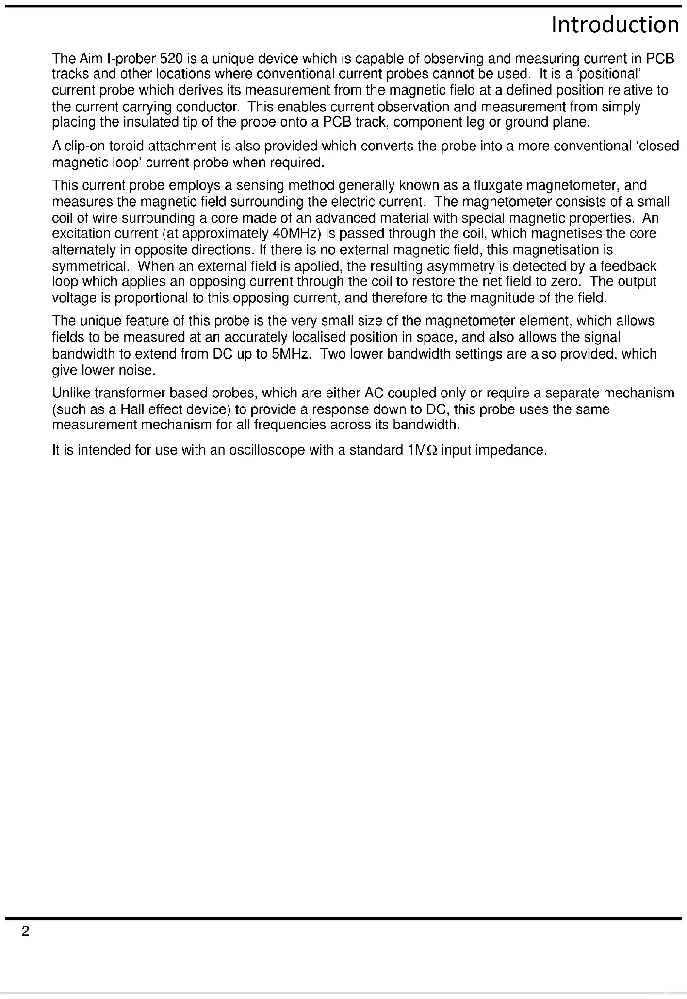 Introduction 2 Specification 3 Safety 4 Installation 6 Connections 6 Operation 7 Maintenance 12 Instructions en Francais Introduction 13 Sécurité 14 Installation 16 Connexions 16 Fonctionnement 17 Maintenance 22 Bedienungsanleitung auf Deutsch Einführung 23 Sicherheit 24 Installation 26 Anschlüsse 26 Betrieb 27 Wartung 32 Istruzioni in Italiano Introduzione 33 Sicurezza 34 Installazione 36 Collegamenti 36 Funzionamento 37 Manutenzione 42 Instrucciones en Espanol Introducción 43 Seguridad 44 Instalación 46 Conexiones 46 Funcionamiento 47 Mantenimiento 532 Introduction The Aim I-prober 520 is a unique device which is capable of observing and measuring current in PCB tracks and other locations where conventional current probes cannot be used. It is a ‘positional’ current probe which derives its measurement from the magnetic field at a defined position relative to the current carrying conductor. This enables current observation and measurement from simply placing the insulated tip of the probe onto a PCB track, component leg or ground plane. A clip-on toroid attachment is also provided which converts the probe into a more conventional ‘closed magnetic loop’ current probe when required. This current probe employs a sensing method generally known as a fluxgate magnetometer, and measures the magnetic field surrounding the electric current. The magnetometer consists of a small coil of wire surrounding a core made of an advanced material with special magnetic properties. An excitation current (at approximately 40MHz) is passed through the coil, which magnetises the core alternately in opposite directions. If there is no external magnetic field, this magnetisation is symmetrical. When an external field is applied, the resulting asymmetry is detected by a feedback loop which applies an opposing current through the coil to restore the net field to zero. The output voltage is proportional to this opposing current, and therefore to the magnitude of the field. The unique feature of this probe is the very small size of the magnetometer element, which allows fields to be measured at an accurately localised position in space, and also allows the signal bandwidth to extend from DC up to 5MHz. Two lower bandwidth settings are also provided, which give lower noise. Unlike transformer based probes, which are either AC coupled only or require a separate mechanism (such as a Hall effect device) to provide a response down to DC, this probe uses the same measurement mechanism for all frequencies across its bandwidth. It is intended for use with an oscilloscope with a standard 1MΩ input impedance.3 Specification General specifications apply for the temperature range 5°C to 40°C with the probe connected to a measuring instrument (oscilloscope or DMM) having an input impedance of 1MΩ || <30pF. Accuracy specifications exclude errors of that measuring instrument and apply for the temperature range 18°C to 28°C after 30 minutes warm-up and calibration at 23°C. Specifications quoted without limits are typical characteristics determined by design and are not guaranteed. Dynamic Characteristics Bandwidth (small signal): DC to 5MHz. Pulse Rise-time (10% - 90%): <70ns. Propagation delay: 60ns typical. Pulse aberrations: <±5% (<1% at lower bandwidth settings). Slew Rate (equivalent): 15A/µs Noise (equivalent in toroid): 6mA rms ; 1.5mA rms at minimum bandwidth setting. Filter settings: Full bandwidth, 500kHz or 2Hz. Magnetic Field Measurement Scaling factor: 250µT (or 200A/m) per output Volt Accuracy and linearity: ±3% Maximum field: ±2·5mT (2000A/m) Current measurement in wire (with toroid attachment) Current range: ±10mA to ±10A (DC + peak). Accuracy and linearity: ±5% Scaling factor: 1 Amp per output Volt. Maximum wire diameter: 3.5mm (unbroken) or 6mm (end fed). Current measurement in PCB track Scaling factor (with control adjusted to suit track width): 1 Amp per Volt for track widths 0·2mm to 3.5mm (0·007” to 0·14”) or 2 Amp per Volt for track widths 3mm to 6.5mm (0·125” to 0·25”) General characteristics Maximum output voltage: ±10V, corresponding to ±2·5mT (field measurement) or ±10A (wire) Maximum bare-wire voltage: 300V rms CAT II (circuits connected directly to the low voltage mains) or 600V rms CAT I (circuits not connected directly to the low voltage mains). Maximum Permitted Transient Overvoltage: 2500V. Maximum track temperature: The maximum temperature of a surface on which the probe measurement tip can be placed for short periods (2 mins max) is 150ºC Probe dimensions: 155mm x 38mm x 28mm max; 2.8mm x 1.8mm at tip Cable length: 2m from probe tip to output BNC Safety & EMC: Complies with EN60950-1 & EN61326-1. For details, request the EU Declaration of Conformity for this instrument via http://www.aimtti.com/support (serial no. needed).4 Safety Current Probe This instrument is Safety Class III according to IEC classification and has been designed to meet the general requirements of EN61010-1 (Safety Requirements for Electrical Equipment for Measurement, Control and Laboratory Use) and sub-part EN61010-031 as applied to this particular form of current probe. This instrument has been tested in accordance with EN61010-1 and EN61010-031 and has been supplied in a safe condition. This instruction manual contains essential information and warnings which have to be followed by the user to ensure safe operation and to retain the instrument in a safe condition. This instrument has been designed for indoor use in a Pollution Degree 2 environment in the temperature range 5°C to 40°C, 20% - 80% RH (non-condensing). It may occasionally be subjected to temperatures between +5° and -10°C without degradation of its safety. Do not operate while condensation is present. WARNINGS and CAUTIONS