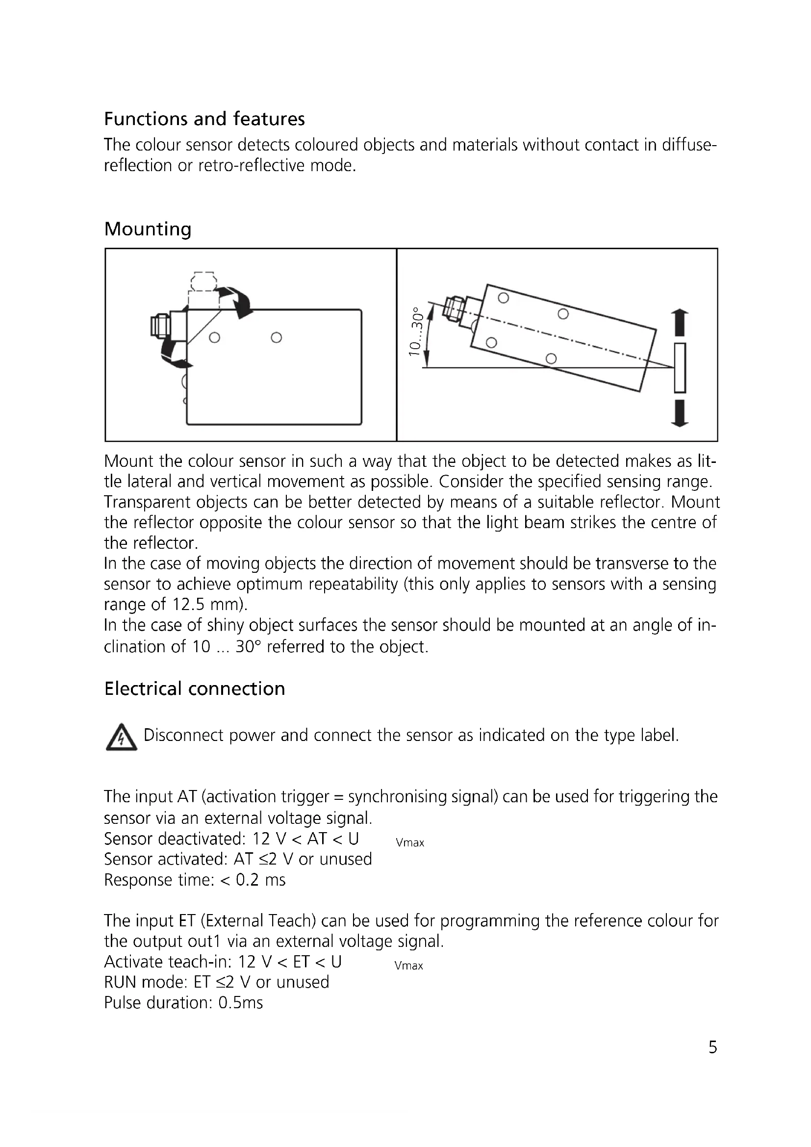 5Functions and features The colour sensor detects coloured objects and materials without contact in diffuse- reflection or retro-reflective mode. Mounting Mount the colour sensor in such a way that the object to be detected makes as lit- tle lateral and vertical movement as possible. Consider the specified sensing range. Transparent objects can be better detected by means of a suitable reflector. Mount the reflector opposite the colour sensor so that the light beam strikes the centre of the reflector. In the case of moving objects the direction of movement should be transverse to the sensor to achieve optimum repeatability (this only applies to sensors with a sensing range of 12.5 mm). In the case of shiny object surfaces the sensor should be mounted at an angle of in- clination of 10 ... 30° referred to the object. Electrical connection Disconnect power and connect the sensor as indicated on the type label. The input AT (activation trigger = synchronising signal) can be used for triggering the sensor via an external voltage signal. Sensor deactivated: 12 V < AT < U Vmax Sensor activated: AT ≤ 2 V or unused Response time: < 0.2 ms The input ET (External Teach) can be used for programming the reference colour for the output out1 via an external voltage signal. Activate teach-in: 12 V < ET < U Vmax RUN mode: ET ≤ 2 V or unused Pulse duration: 0.5ms 10...30° 5Controls and indicators Setting and programming