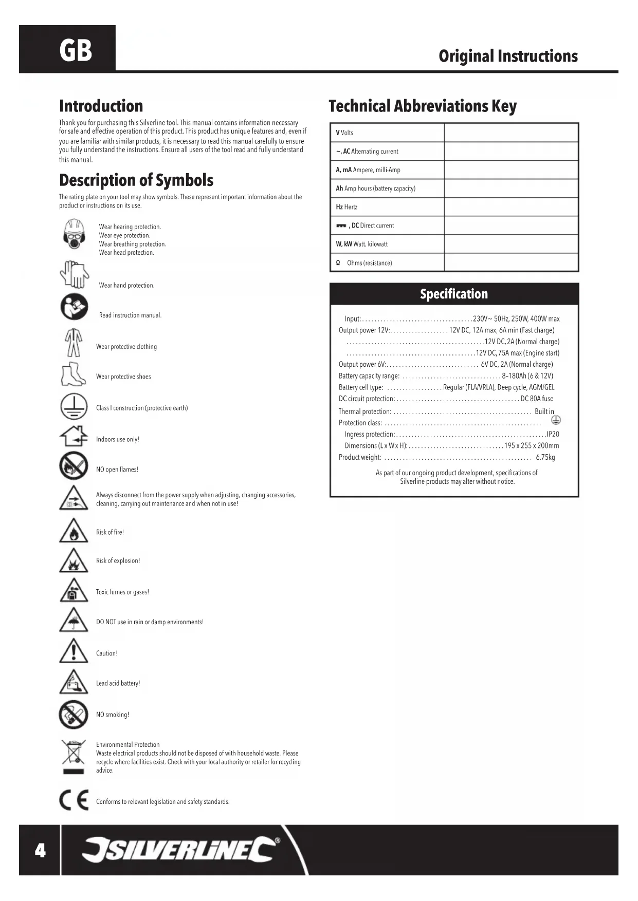 Technical Abbreviations Key Specication Description of Symbols The rating plate on your tool may show symbols. These represent important information about the product or instructions on its use.Wear hearing protection. Wear eye protection. Wear breathing protection.Wear head protection.Wear hand protection.Read instruction manual.Wear protective clothingWear protective shoesClass I construction (protective earth)Indoors use only!NO open ames!Always disconnect from the power supply when adjusting, changing accessories, cleaning, carrying out maintenance and when not in use!Risk of re!Risk of explosion!Toxic fumes or gases!DO NOT use in rain or damp environments!Caution!Lead acid battery!NO smoking!Environmental Protection Waste electrical products should not be disposed of with household waste. Please recycle where facilities exist. Check with your local authority or retailer for recycling advice.Conforms to relevant legislation and safety standards. Introduction Thank you for purchasing this Silverline tool. This manual contains information necessary for safe and effective operation of this product. This product has unique features and, even if you are familiar with similar products, it is necessary to read this manual carefully to ensure you fully understand the instructions. Ensure all users of the tool read and fully understand this manual. Original Instructions V Volts~, AC Alternating currentA, mA Ampere, milli-AmpAh Amp hours (battery capacity)Hz Hertz , DC Direct currentW, kW Watt, kilowattΩ Ohms (resistance) Specication