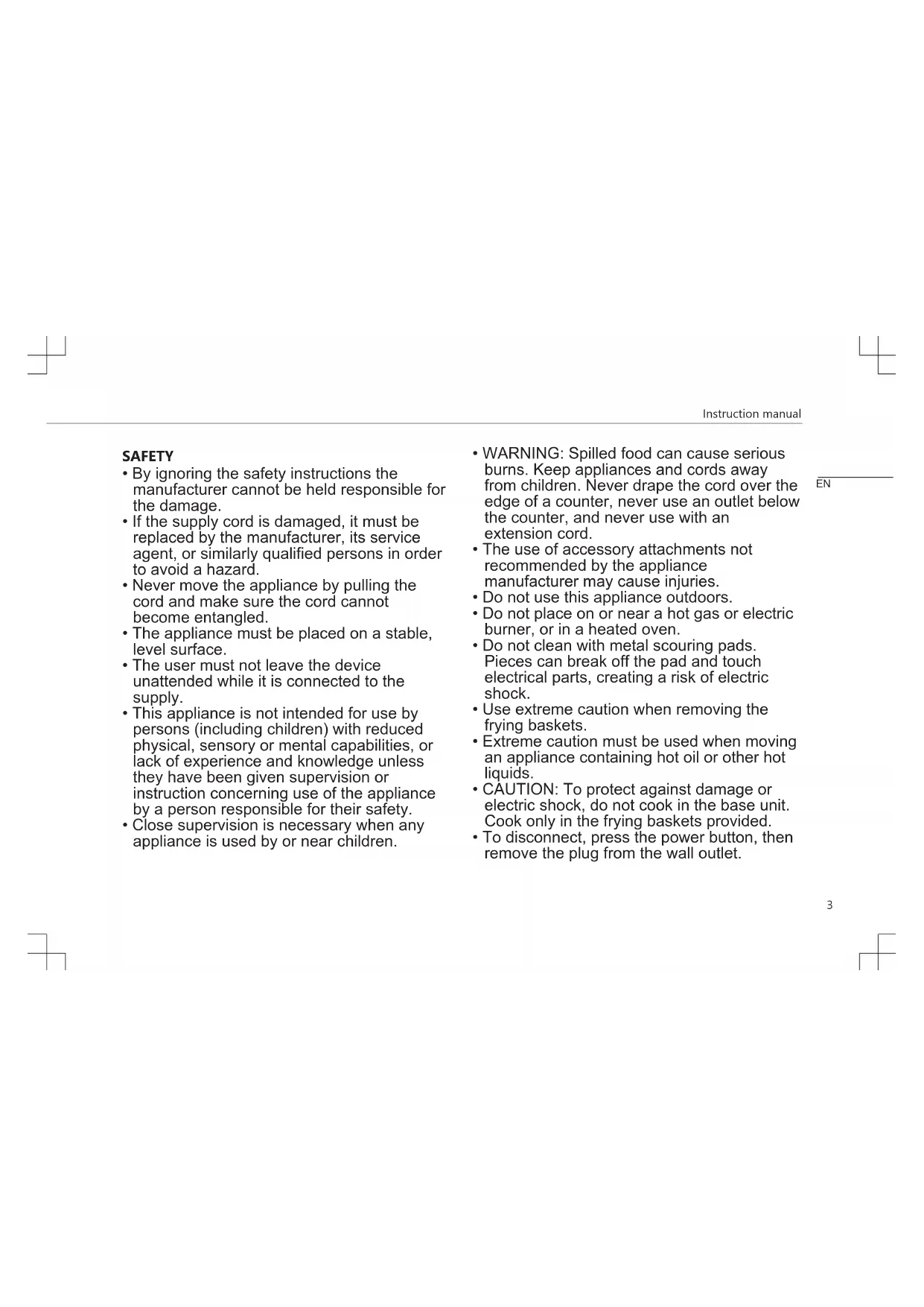 The food has not been cooked evenly Different items of food with different cooking times have been prepared at the same time Place food with a longer cooking time in the Aerofryer first, then add ingredients with a shorter cooking time later Items of food which require different cooking temperatures have been prepared at the same time. Prepare items of food with different cooking temperatures one after the other. The set cooking time was too short or the temperature too low Increase the cooking time or temperature The items of food are piled on top of one another Spread the food and mix it There are too many ingredients in the baskets Reduce the amount of ingredients The food is slightly burnt The selected temperature is too high or the cooking time too long Reduce the temperature or cooking time Chips made from fresh potatoes are not crispy The potatoes contain too much water Cut the potatoes into narrower pieces. Dab the potato pieces dry and then trickle a little cooking oil over them During use, an unpleasant smell is detected The Aerofryer is dirty Follow the instructions for cleaning under the “Cleaning and Maintenance” section of this manual During use, an unpleasant smell is detected The Air Fryer is being used for the first time. A smell often develops when new appliances are first used. The smell should disappear once the appliance has been used several times Error Codes E1 - Broken circuit of the thermal sensor. Contact the customer service department. E2 - Short circuit of the thermal sensor ENVIRONMENTInstruction manual