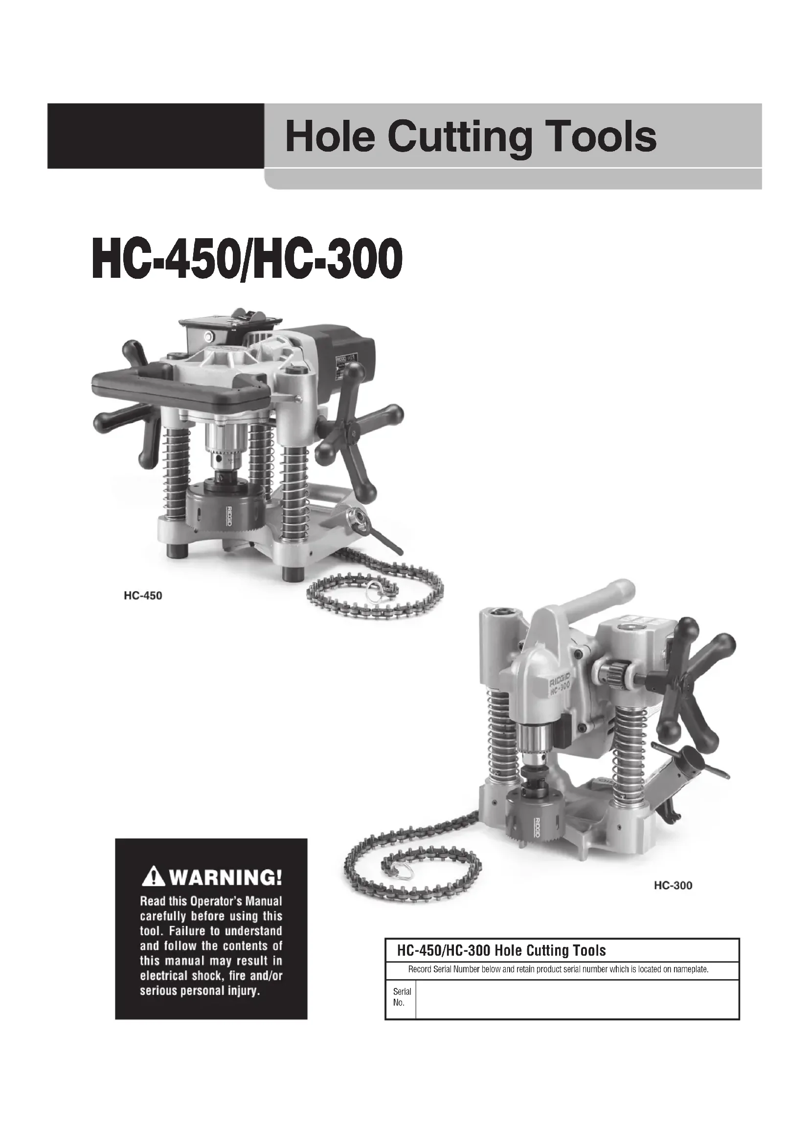 - Store idle tools out of the reach of children and other untrained persons. Tools are dangerous in the hands of untrained users. HC-450/HC-300 Hole Cutting Tools