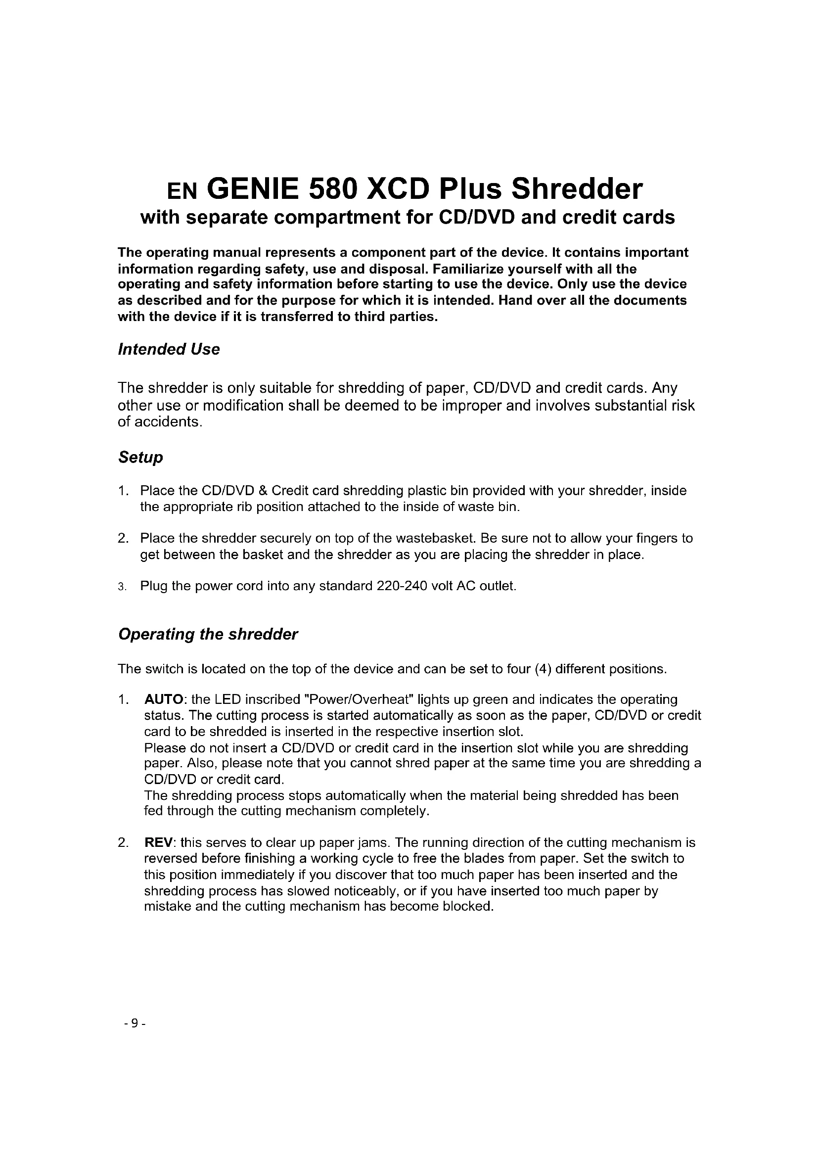 should be done if the paper basket must be emptied or the device will not be used for a longer period of time. This device is only intended for private use indoors. Do not use the shredder for commercial purposes or outdoors. Continuous use of the shredder at maximum sheet capacity for a period over 3 minutes without any interruptions leads to the motor overheating whereby the device then switches off automatically. The "Power/Overheat" LED lights up red. Allow the device to cool down to room temperature before putting it into operation again. (Also refer to Averting Paper Jams and Overheating.) The "Power/Overheat" LED then lights up green again. Shredder capacity The 580 XCD Plus shreds up to 10 sheets of paper (A4, 80 g/m²). The paper width can be up to 22 cm. When shredding small items such as envelopes or credit card receipts, insert them into the centre of the feed opening. Please ensure that you never insert more than the maximum amount specified above into the cutting mechanism. Doing so may damage the device. Separate cutting unit for CDs/DVDs and credit cards This document shredder is equipped with a separate cutting mechanism for CDs/DVDs and credit cards. CDs/DVDs are cut into 3 pieces. As there is always a risk of splintering with these materials, keep your face at a safe distance when inserting CDs/DVDs. Credit cards must be inserted horizontally. The shredded material is collected in a separate waste container, making it easy to dispose of in an environmentally friendly manner!- 11 - Cautions