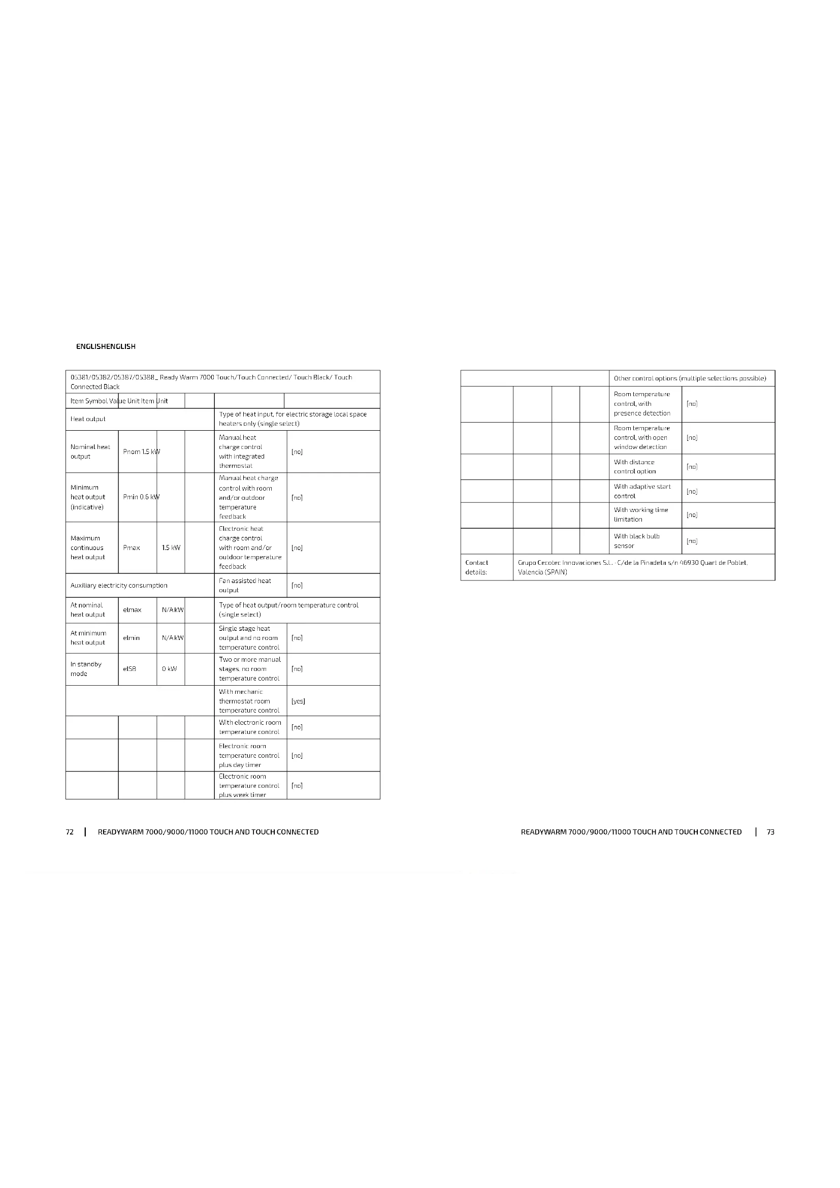 Turn the heater upside down. Place the casters base assemblies between the end ns. Attach them to the heater using the U-bolts and wing nuts supplied. Tighten the wing nuts. Turn the heater the right way up. Fig. 3.READYWARM 7000/9000/11000 TOUCH AND TOUCH CONNECTEDREADYWARM 7000/9000/11000 TOUCH AND TOUCH CONNECTED 3534 ENGLISH ENGLISH ReadyWarm 11000 Touch Black (05391) ReadyWarm 11000 Touch Connected Black (05392) 2500 W, 220-240 V~, 50/60 Hz Made in China | Designed in Spain
