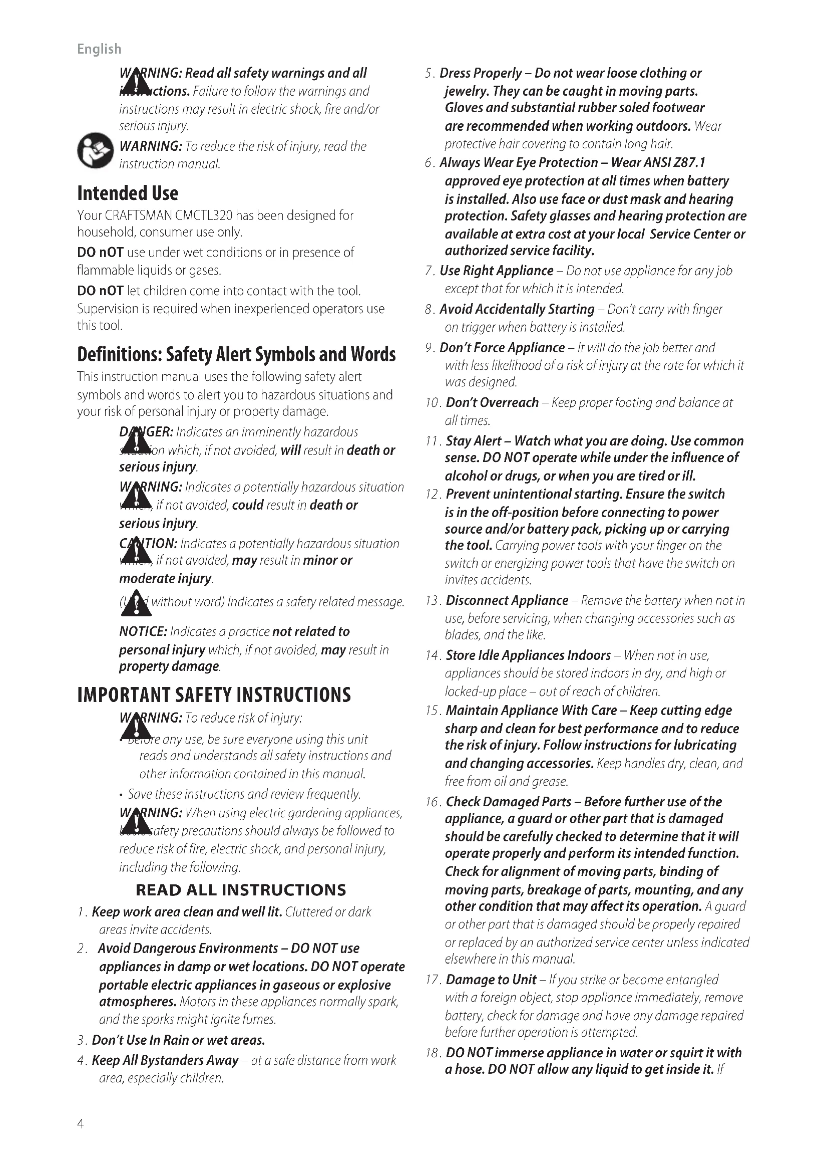 5 . Dress Properly – Do not wear loose clothing or jewelry. They can be caught in moving parts. Gloves and substantial rubber soled footwear are recommended when working outdoors. Wear protective hair covering to contain longhair. 6 . Always Wear Eye Protection – Wear ANSI Z87.1 approved eye protection at all times when battery is installed. Also use face or dust mask and hearing protection. Safety glasses and hearing protection are available at extra cost at your local Service Center or authorized servicefacility. 7 . Use Right Appliance – Do not use appliance for any job except that for which it isintended. 8 . Avoid Accidentally Starting – Don’t carry with finger ontrigger when battery isinstalled. 9 . Don’t Force Appliance – It will do the job better and with less likelihood of a risk of injury at the rate for which it wasdesigned. 10 . Don’t Overreach – Keep proper footing and balance at alltimes. 11 . Stay Alert – Watch what you are doing. Use common sense. DO NOT operate while under the influence of alcohol or drugs, or when you are tired or ill. 12 . Prevent unintentional starting. Ensure the switch is in the off‑position before connecting to power source and/or battery pack, picking up or carrying the tool. Carrying power tools with your finger on the switch or energizing power tools that have the switch on invitesaccidents. 13 . Disconnect Appliance – Remove the battery when not in use, before servicing, when changing accessories such as blades, and thelike. 14 . Store Idle Appliances Indoors – When not in use, appliances should be stored indoors in dry, and high or locked‑up place – out of reach ofchildren. 15 . Maintain Appliance With Care – Keep cutting edge sharp and clean for best performance and to reduce the risk of injury. Follow instructions for lubricating and changing accessories. Keep handles dry, clean, and free from oil andgrease. 16 . Check Damaged Parts – Before further use of the appliance, a guard or other part that is damaged should be carefully checked to determine that it will operate properly and perform its intended function. Check for alignment of moving parts, binding of moving parts, breakage of parts, mounting, and any other condition that may affect its operation. A guard or other part that is damaged should be properly repaired or replaced by an authorized service center unless indicated elsewhere in thismanual. 17 . Damage to Unit – If you strike or become entangled with a foreign object, stop appliance immediately, remove battery, check for damage and have any damage repaired before further operation isattempted. 18 . DO NOT immerse appliance in water or squirt it with a hose. DO NOT allow any liquid to get inside it. If