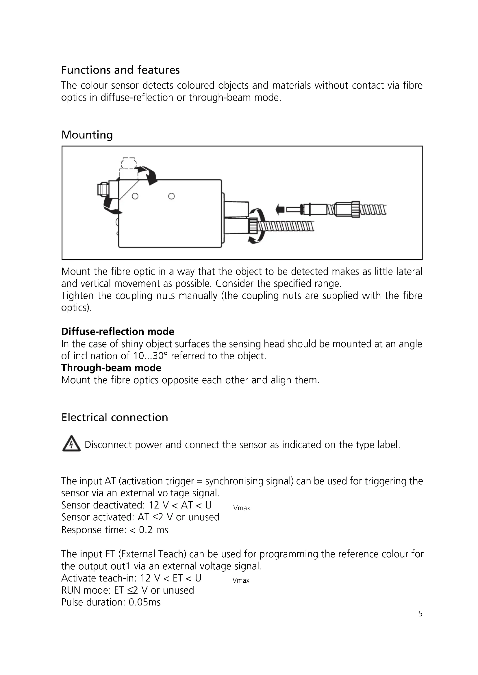 5Functions and features The colour sensor detects coloured objects and materials without contact via fibre optics in diffuse-reflection or through-beam mode. Mounting Mount the fibre optic in a way that the object to be detected makes as little lateral and vertical movement as possible. Consider the specified range. Tighten the coupling nuts manually (the coupling nuts are supplied with the fibre optics). Diffuse-reflection mode In the case of shiny object surfaces the sensing head should be mounted at an angle of inclination of 10...30° referred to the object. Through-beam mode Mount the fibre optics opposite each other and align them. Electrical connection Disconnect power and connect the sensor as indicated on the type label. The input AT (activation trigger = synchronising signal) can be used for triggering the sensor via an external voltage signal. Sensor deactivated: 12 V < AT < U Vmax Sensor activated: AT ≤ 2 V or unused Response time: < 0.2 ms The input ET (External Teach) can be used for programming the reference colour for the output out1 via an external voltage signal. Activate teach-in: 12 V < ET < U Vmax RUN mode: ET ≤ 2 V or unused Pulse duration: 0.05ms 5Controls and indicators Setting and programming