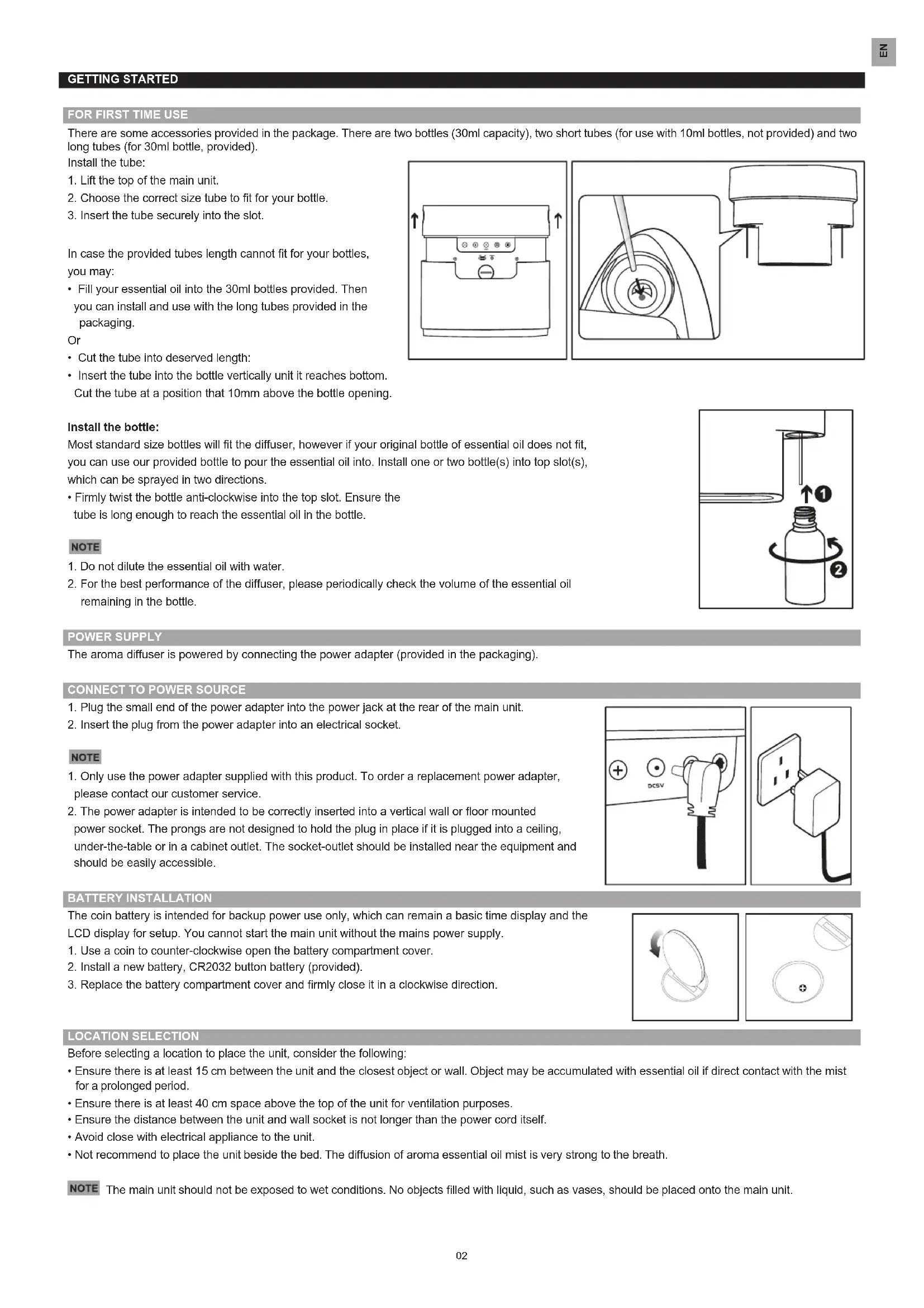 remaining in the bottle. POWER SUPPLY The aroma diffuser is powered by connecting the power adapter (provided in the packaging).