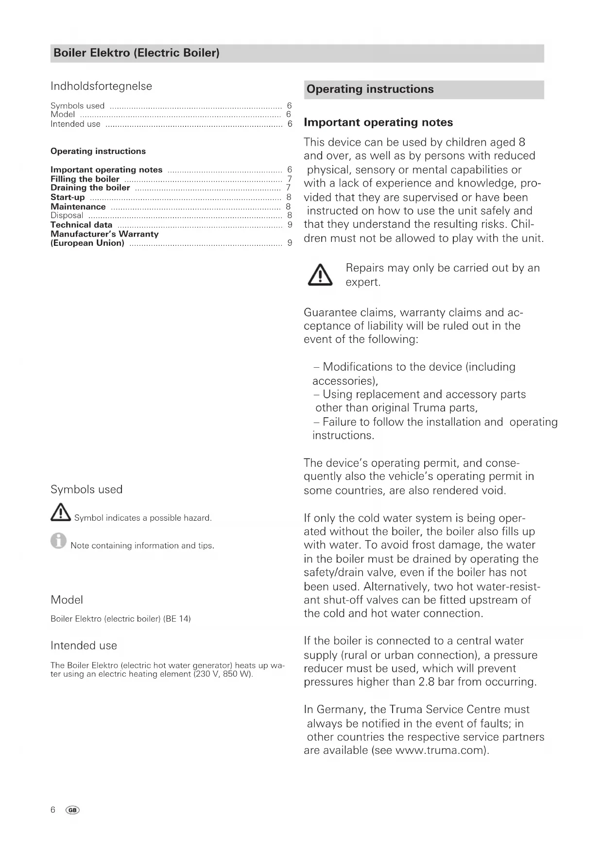 Download the instructions for your Boiler in PDF format for free! Find your manual Boiler Elektro - TRUMA and take your electronic device back in hand. On this page are published all the documents necessary for the use of your device. Boiler Elektro by TRUMA.