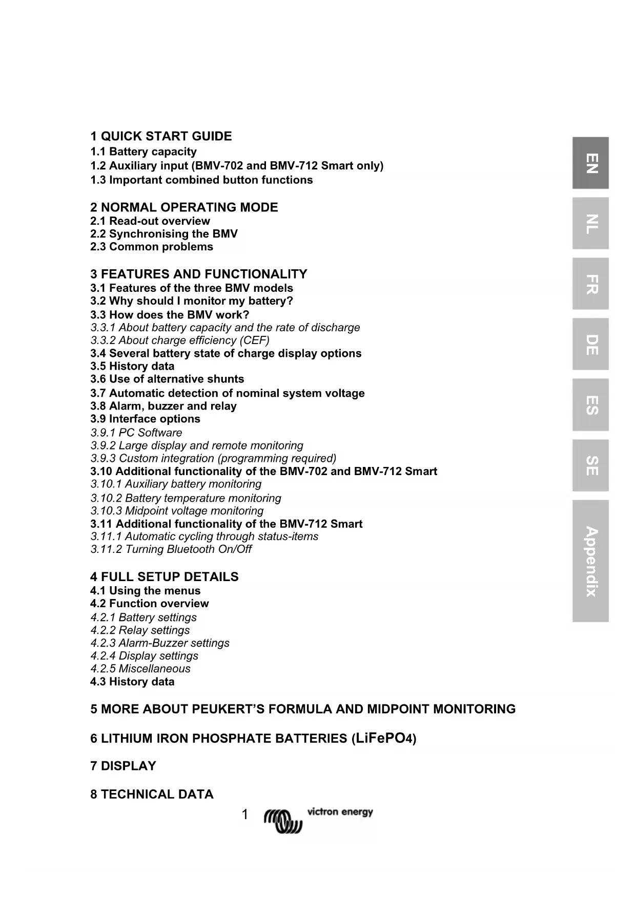 Batteries are used in a wide variety of applications, mostly to store energy for later use. But how much energy is stored in the battery? No one can tell by just looking at it.13 NL FR DE ES SE IT PT EN NL FR DE ES SE Appendix The service life of batteries depends on many factors. Battery life may be shortened by undercharging, overcharging, excessively deep discharges, excessive charge or discharge current, and high ambient temperature. By monitoring the battery with an advanced battery monitor, important feedback is given to the user so that remedial measures can be taken when necessary. Doing this, which extends battery life, the BMV will quickly pay for itself.