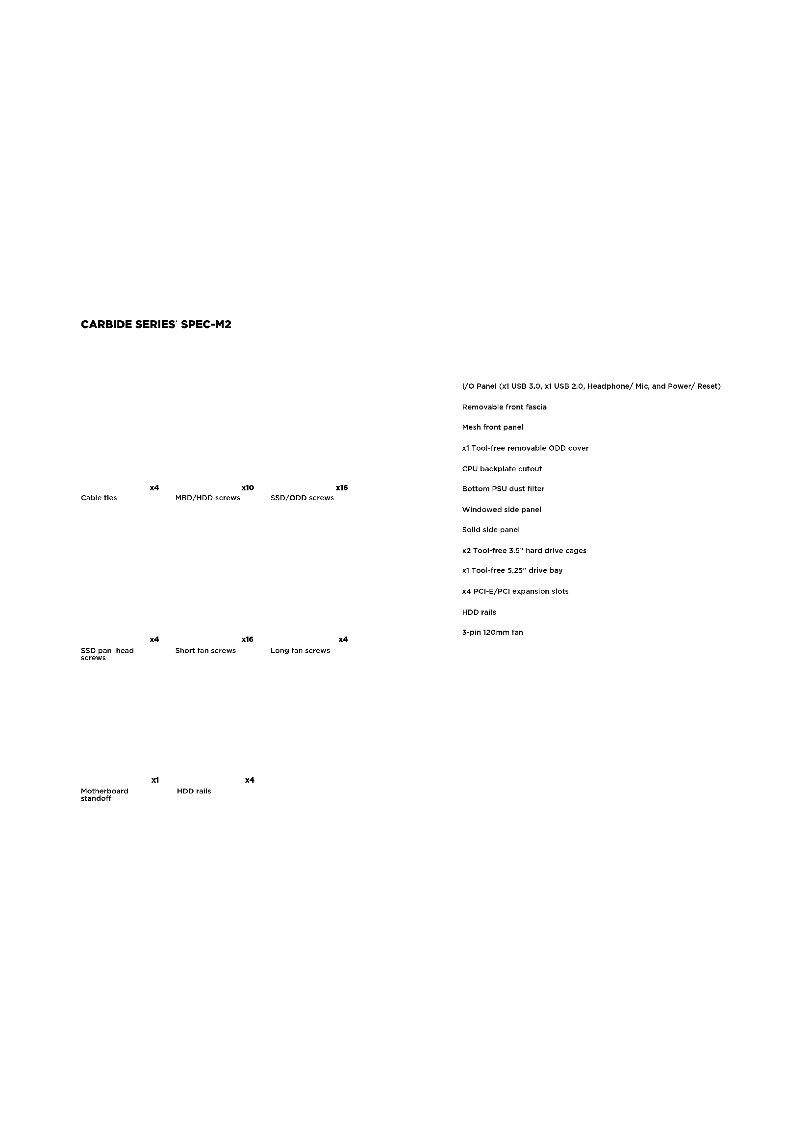 To learn more about this case visit the product page at corsair.com Fan Mount Locations Front x2 120mm (1 included)To p x2 120mmRear x1 120mmBottom xSide xMid x SPEC-M2 FAQ USB 3.0HD AUDIOUSB 2.0RESET SWPOWER LED +POWER LED –POWER SW HDD LEDCARBIDE SERIES