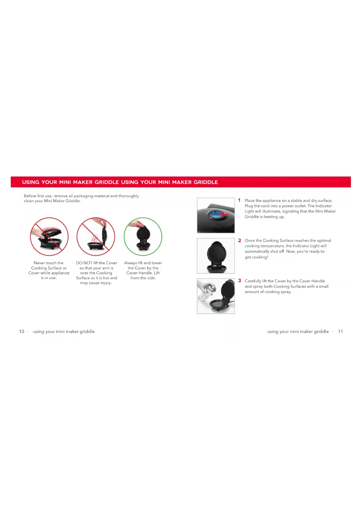 Place the appliance on a stable and dry surface. Plug the cord into a power outlet. The Indicator Light will illuminate, signaling that the Mini Maker Griddle is heating up. Once the Cooking Surface reaches the optimal cooking temperature, the Indicator Light will automatically shut off. Now, you’re ready to get cooking! Carefully lift the Cover by the Cover Handle and spray both Cooking Surfaces with a small amount of cooking spray.12 ∙ using your mini maker griddle Always allow the appliance to cool completely before moving, cleaning, or storing. Do not submerge appliance in water or any other liquids. Never use abrasive cleaning agents to clean your appliance as this may damage the Mini Maker Griddle. In order to keep your Mini Maker Griddle in pristine working order, thoroughly clean the appliance after each use. This will prevent the build-up of food or oil.