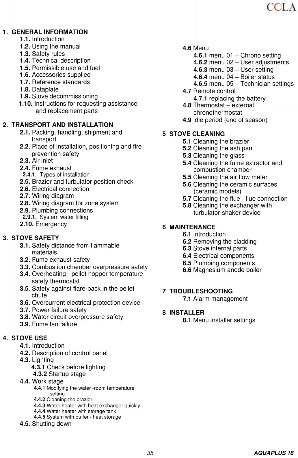 - Read the use and maintenance manual before installing, lighting and servicing the stove. - Have installation, the electrical connection, testing and maintenance carried out by a qualified and/or authorised technician. - Connect the stove to an approved flue by means of an inspectionable terminal; several units can be connected only if allowed by the local regulations and by the flue inspection Body. - Connect the stove to the suction system by means of a pipe or air inlet from outside. - Connect the stove to an approved 230 V-50 Hz electrical socket. - With the TERMO model, connect the unit to the heating system; under no circumstances can it be used without the water connection and without water in the heating chamber. - Make sure the electrical system and the sockets are suitable for the maximum absorption of the unit, specified on the label and in this manual. - The stove must be unplugged and cold before carrying out any maintenance. - Do not use flammable liquids or substances to light the stove or rekindle the flame: when the stove is lit, pellet ignition is automatic. - The pellet stove must only be fed with wood pellets having the characteristics described in this manual. - The stove must not be used as an incinerator. - Never block the combustion air inlet and fume outlet openings. - Do not handle easily flammable or explosive substances near the stove while it is operating. - Do not remove the pellet hopper protection grille. - Do not operate the stove with the fire door open and/or the glass damaged or broken. - During operation the intense heat generated by combustion of the pellets makes the external surfaces of the stove very hot, and in particular the fire door, handle and flue pipe. Therefore avoid contact with these parts without suitable protection. - Keep objects that are flammable and/or not heat resistant at a suitably safe distance. - Clean the brazier regularly every time the stove is lit or whenever reloading pellets. - Avoid the creation of smoke and unburnt products during lighting and/or normal operation; an excessive accumulation of unburnt pellets in the brazier must be eliminated manually before relighting the stove. - Have the pipe and smoke baffles inside the combustion chamber cleaned regularly by qualified personnel. - Warn children and guests about the hazards described above. - In case of operation problems, the stove can be relit only after eliminating the cause of the problem. - Any tampering and/or unauthorised replacements with non-original parts of the stove can create a risk for the user's safety and relieves the manufacturer of any civil or penal liability. - Only use original replacement parts recommended by the manufacturer. The manufacturer declines any liability for problems, damage or accidents caused by failure to follow or apply the instructions contained in this manual.37 AQUAPLUS 18