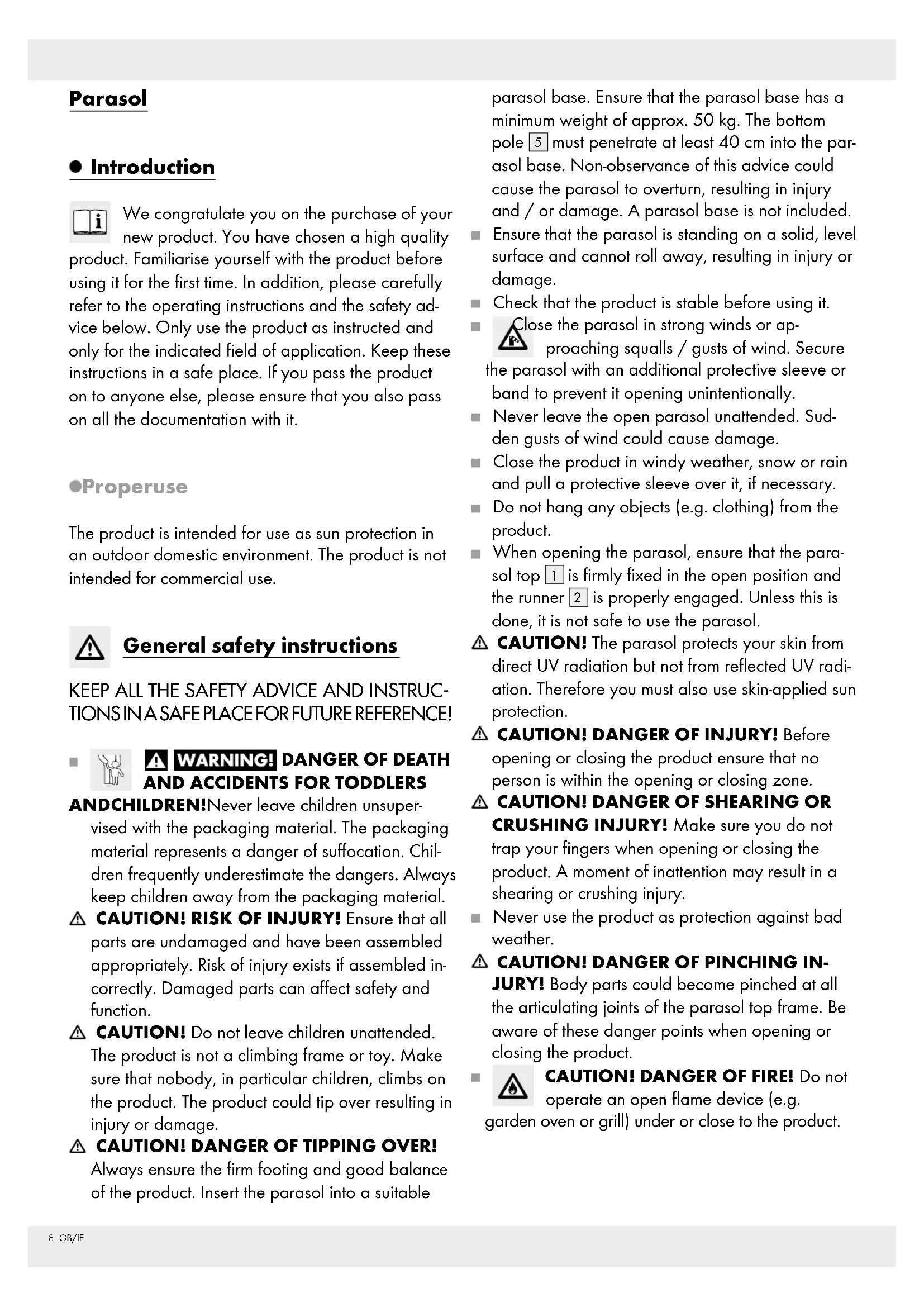 AND CHILDREN! Never leave children unsuper- vised with the packaging material. The packaging material represents a danger of suffocation. Chil- dren frequently underestimate the dangers. Always keep children away from the packaging material. CAUTION! RISK OF INJURY! Ensure that all parts are undamaged and have been assembled appropriately. Risk of injury exists if assembled in- correctly. Damaged parts can affect safety and function. CAUTION! Do not leave children unattended. The product is not a climbing frame or toy. Make sure that nobody, in particular children, climbs on the product. The product could tip over resulting in injury or damage. CAUTION! DANGER OF TIPPING OVER! Always ensure the firm footing and good balance of the product. Insert the parasol into a suitable parasol base. Ensure that the parasol base has a minimum weight of approx. 50 kg. The bottom pole