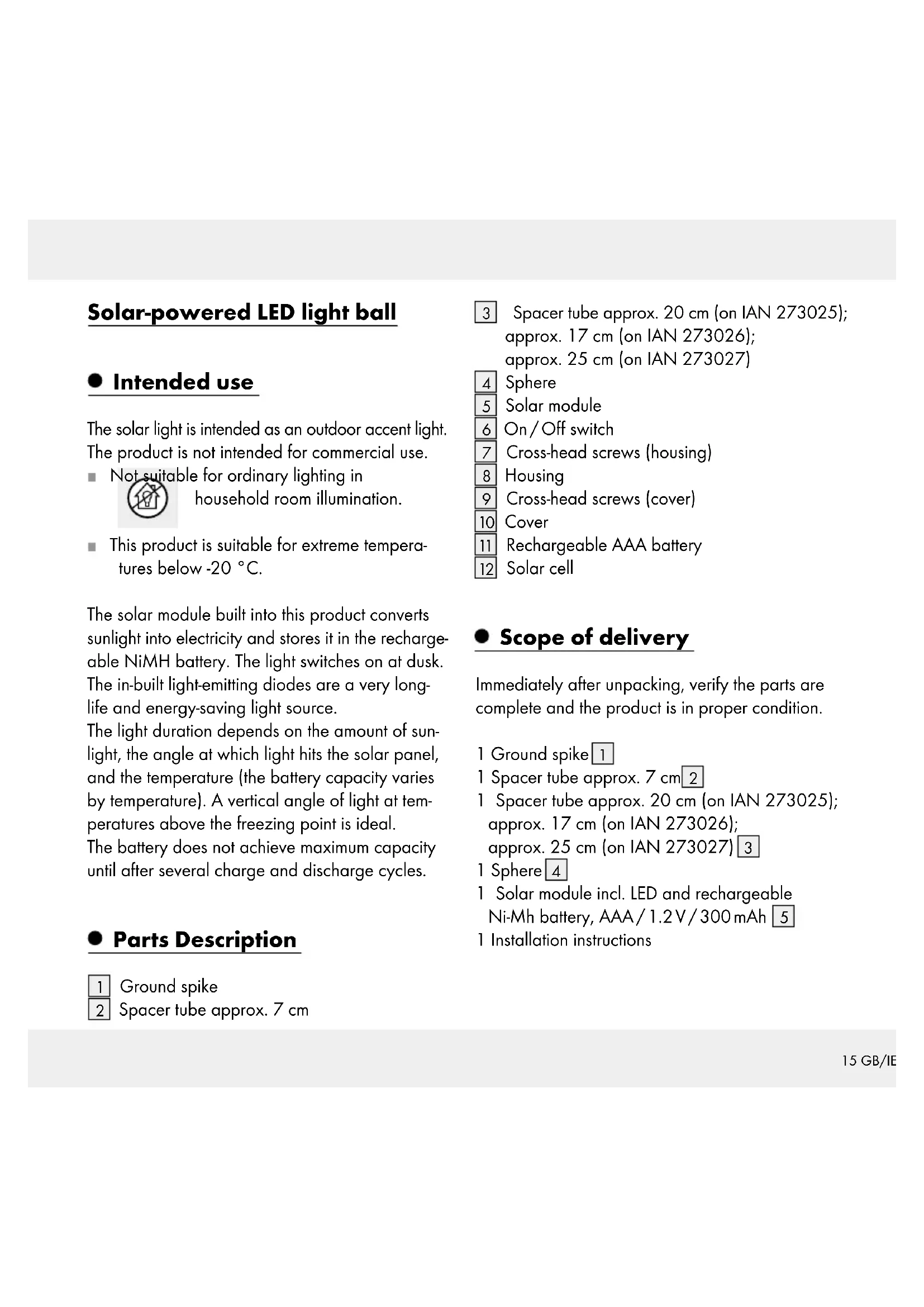 HAZARD! Do not use the solar light in explosive environments con- taining flammable vapours, gasses or dusts.17 GB/IE Product-specific safety instructions Do not expose the solar light to strong vibration or high mechanical loads. Make sure the solar cell is free of dirt and free of snow and ice in winter. Otherwise the per- formance of the solar panel will be diminished. Cold temperatures negatively impact the bat- tery operating time. Clean and store the solar light in a dry, warm location during extended periods of non-use, e.g. in winter. In the event of damage, repairs or other prob- lems with the solar light, please contact an electrician. The LEDs cannot be replaced.
