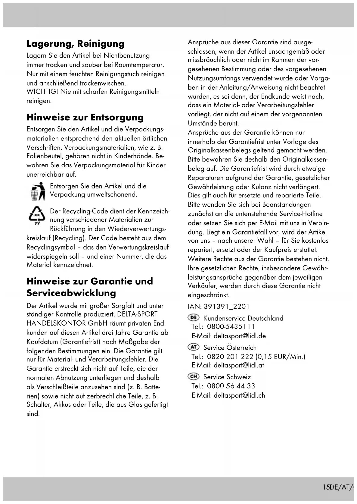 Important: make sure your thighs re- main parallel to each other. Push your pelvis forwards, keeping your upper body upright. Storage, cleaning When not in use, always store the product clean and dry at room temperature. Only clean the product with a damp cloth and wipe dry afterwards. IMPORTANT! Never clean the product with harsh cleaning agents. Disposal Dispose of the article and the packaging materi- als in accordance with current local regulations. Packaging materials such as foil bags are not suitable to be given to children. Keep the pack- aging materials out of the reach of children. Dispose of the products and the packaging in an environmentally friendly manner. The recycling code is used to identify various materials for recycling. The code consists of the recycling symbol – which is meant to reflect the recycling cycle – and a number which identifies the material. Notes on the guarantee and service handling The product was produced with great care and under continuous quality control. DELTA-SPORT HANDELSKONTOR GmbH gives private end customers a three-year guarantee on this product from the date of purchase (guarantee period) in accordance with the following provisions. The guarantee is only valid for material and manufacturing defects. The guarantee does not cover parts subject to normal wear and tear that are thus considered wear parts (e.g. batteries) or fragile parts such as switches, rechargeable batteries, or parts made of glass. Claims under this guarantee are excluded if the product has been used incorrectly, improperly, or contrary to the intended purpose, or if the provisions in the instructions for use were not observed, unless the end customer proves that a material or manufacturing defect exists that was not caused by one of the aforementioned circumstances. Claims under the guarantee can only be made within the guarantee period by presenting the original sales receipt. Please therefore keep the original sales receipt. The guarantee period is not extended by any repairs carried out under the guarantee, under statutory guarantees, or as a gesture of goodwill. This also applies to replaced and repaired parts. If you wish to make a claim please first contact the service hotline mentioned below or contact us by e-mail. If there is a guarantee case, then the product will be repaired or replaced free of charge to you or the purchase price will be refunded, depending on our choice. Your legal rights, in particular guarantee claims against the respective seller, are not limited by this guarantee. IAN: 391391_2201 Service Great Britain Tel.: 0800 404 7657 E-Mail: deltasport@lidl.co.uk Service Ireland Tel.: 11800 101010 E-Mail: deltasport@lidl.ie GB/IE21 Félicitations ! Vous venez d’acquérir un article de grande qualité. Avant la première utilisation, familiari- sez-vous avec l’article. Pour cela, veuillez lire attentive- ment la notice d’utilisation suivante. Utilisez l’article uniquement comme indiqué et pour les domaines d’utilisation mentionnés. Conservez bien cette notice d’utilisation. Si vous cédez l’article à un tiers, veillez à lui remettre l’ensemble de la documentation. Étendue de la livraison 1 kettlebell 1 notice d’utilisation 1 guide de démarrage Caractéristiques techniques KK-11471 : env. 4 kg KK-11472 : env. 6 kg KK-11473 : env. 8 kg Date de fabrication (mois/année) : 06/2022 Utilisation conforme à sa destination Cet article a été développé comme un outil d’entraînement avec lequel vous pouvez en- traîner tout votre corps. L’article est conçu pour un usage privé et ne convient pas à des fins médicales, thérapeutiques et commerciales. Consignes de sécurité Danger de mort !