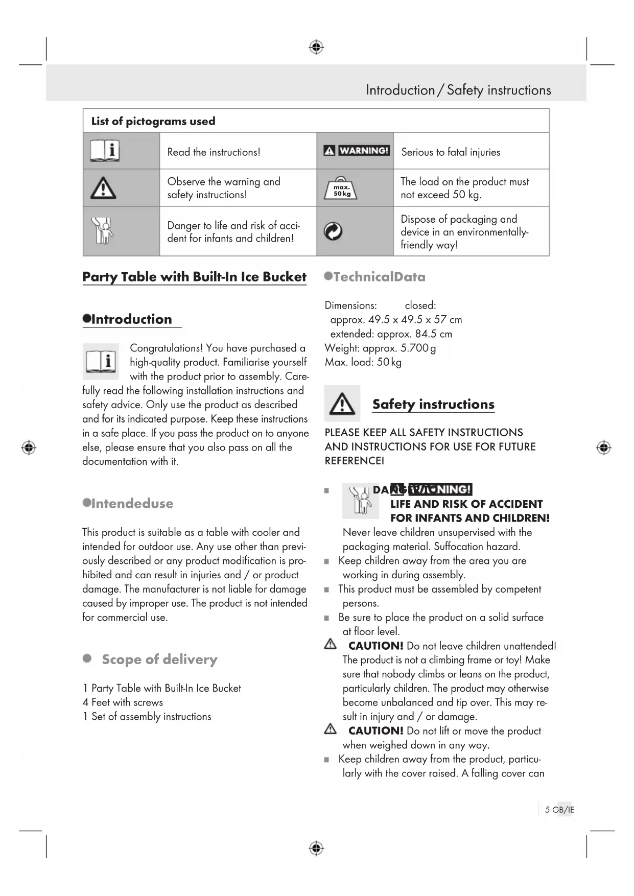 5 GB/IE Introduction / Safety instructions Party Table with Built-In Ice Bucket Introduction Congratulations! You have purchased a high-quality product. Familiarise yourself with the product prior to assembly. Care- fully read the following installation instructions and safety advice. Only use the product as described and for its indicated purpose. Keep these instructions in a safe place. If you pass the product on to anyone else, please ensure that you also pass on all the documentation with it. Intended use This product is suitable as a table with cooler and intended for outdoor use. Any use other than previ- ously described or any product modification is pro- hibited and can result in injuries and / or product damage. The manufacturer is not liable for damage caused by improper use. The product is not intended for commercial use. Scope of delivery 1 Party Table with Built-In Ice Bucket 4 Feet with screws 1 Set of assembly instructions Technical Data Dimensions: closed: approx. 49.5 x 49.5 x 57 cm extended: approx. 84.5 cm Weight: approx. 5.700 g Max. load: 50 kg Safety instructions