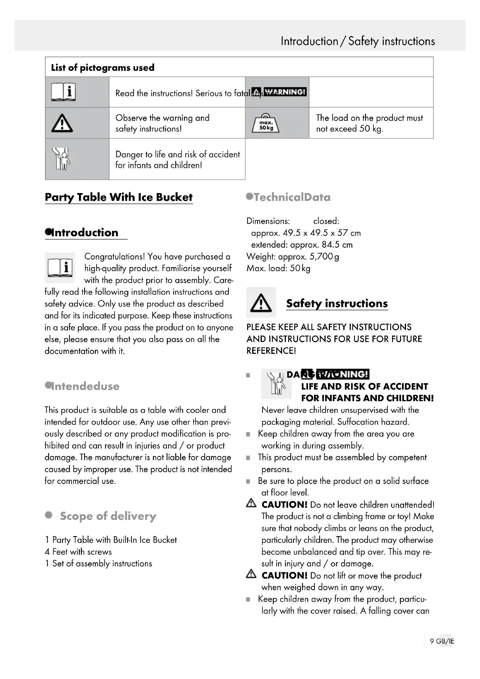 FOR INFANTS AND CHILDREN! Never leave children unsupervised with the packaging material. Suffocation hazard. Keep children away from the area you are working in during assembly. This product must be assembled by competent persons. Be sure to place the product on a solid surface at floor level. CAUTION! Do not leave children unattended! The product is not a climbing frame or toy! Make sure that nobody climbs or leans on the product, particularly children. The product may otherwise become unbalanced and tip over. This may re- sult in injury and / or damage. CAUTION! Do not lift or move the product when weighed down in any way. Keep children away from the product, particu- larly with the cover raised. A falling cover can10 GB/IE … / Assembly / Cleaning and Care / Disposal / Warranty and Service cause serious injuries to a child‘s head or hands. Watch your own hands. Keep animals away from the product. Out of control animals may tip the product over. Do not stand or sit on the product. The product could tip over. Injuries and property damage could result. max. 50 kg The load on the product must not ex- ceed 50 kg. Failure to observe this advice may result in injury and / or product damage. Assembly Note: Assemble the product on an adequately sized, scratch-resistant surface. If necessary, cover the ground to prevent scratches. Install the 4 feet as shown in figures A to D. For the cover, please proceed as shown in figures E to H. Note: Pull the tabletop up to the marking and turn the locking mechanism to the left (Fig. E + F). Adjust (open / close) the drain as shown in figure I or J, respectively. Cleaning and Care To remove more stubborn dirt, use a damp cloth and, if necessary, a mild cleaning agent. Disposal The packaging is made entirely of recyclable mate- rials, which you may dispose of at local recycling facilities. Contact your local refuse disposal authority for more details of how to dispose of your worn-out product. Warranty and Service This product has a 2 year warranty from the date of purchase covering defects in material or manufacture. The warranty does not cover: