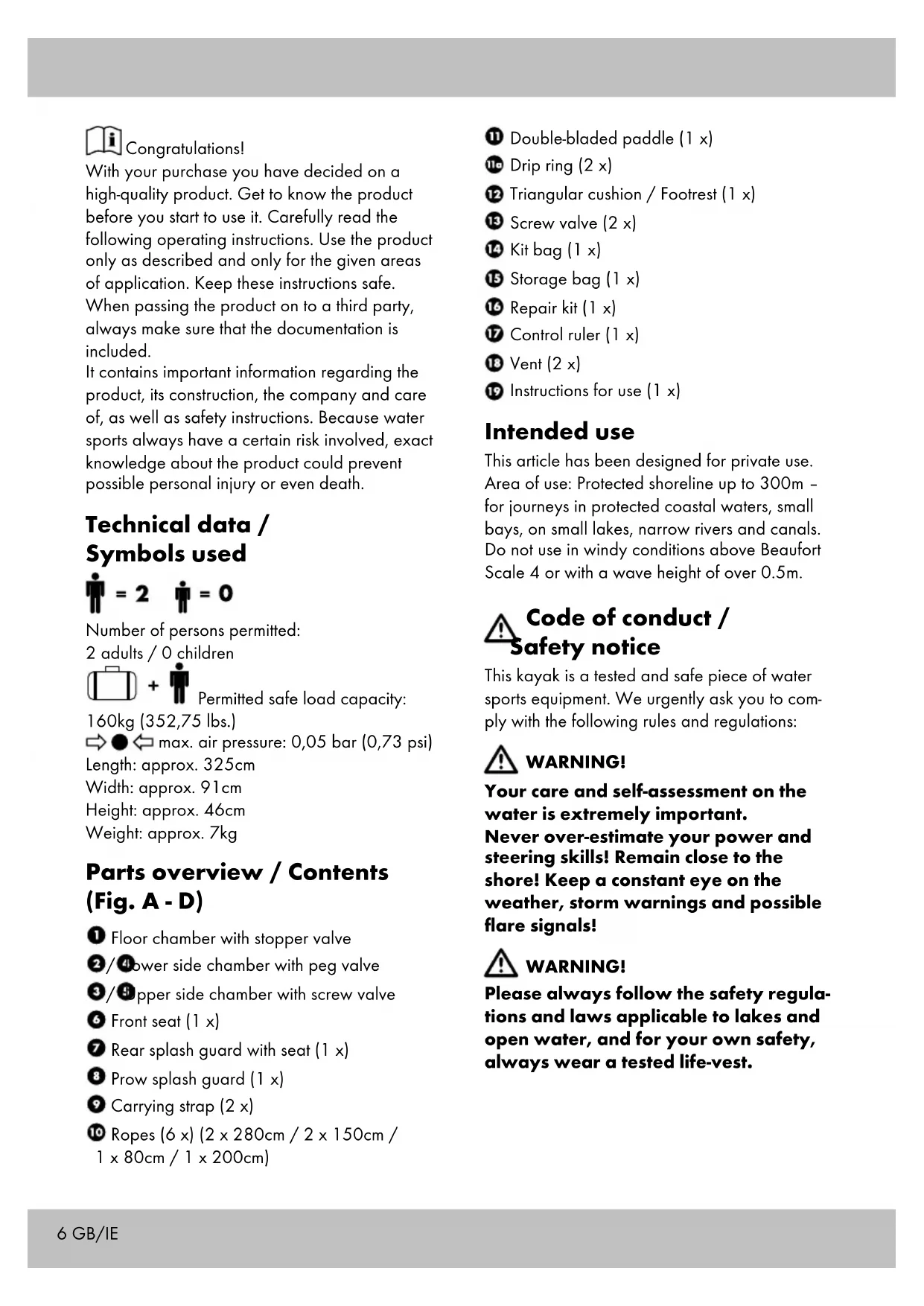 - 3-year warranty Contents Conforms with ISO 6185-1, Category III, Type B6 GB/IE Congratulations! With your purchase you have decided on a high-quality product. Get to know the product before you start to use it. Carefully read the following operating instructions. Use the product only as described and only for the given areas of application. Keep these instructions safe. When passing the product on to a third party, always make sure that the documentation is included. It contains important information regarding the product, its construction, the company and care of, as well as safety instructions. Because water sports always have a certain risk involved, exact knowledge about the product could prevent possible personal injury or even death. Technical data / Symbols used Number of persons permitted: 2 adults / 0 children Permitted safe load capacity: 160kg (352,75 lbs.) max. air pressure: 0,05 bar (0,73 psi) Length: approx. 325cm Width: approx. 91cm Height: approx. 46cm Weight: approx. 7kg Parts overview / Contents (Fig. A - D) Floor chamber with stopper valve / Lower side chamber with peg valve / Upper side chamber with screw valve Front seat (1 x) Rear splash guard with seat (1 x) Prow splash guard (1 x) Carrying strap (2 x) Ropes (6 x) (2 x 280cm / 2 x 150cm / 1 x 80cm / 1 x 200cm) Double-bladed paddle (1 x) Drip ring (2 x) Triangular cushion / Footrest (1 x) Screw valve (2 x) Kit bag (1 x) Storage bag (1 x) Repair kit (1 x) Control ruler (1 x) Vent (2 x) Instructions for use (1 x) Intended use This article has been designed for private use. Area of use: Protected shoreline up to 300m – for journeys in protected coastal waters, small bays, on small lakes, narrow rivers and canals. Do not use in windy conditions above Beaufort Scale 4 or with a wave height of over 0.5m. Code of conduct / Safety notice This kayak is a tested and safe piece of water sports equipment. We urgently ask you to com- ply with the following rules and regulations: WARNING! Your care and self-assessment on the water is extremely important. Never over-estimate your power and steering skills! Remain close to the shore! Keep a constant eye on the weather, storm warnings and possible flare signals! WARNING! Please always follow the safety regula- tions and laws applicable to lakes and open water, and for your own safety, always wear a tested life-vest.7GB/IE WARNING! Danger of suffocation for children! Never allow children to play unsuper- vised with the packaging materials, or the article itself. WARNING! If a person happens to have fallen over- board, their rescue must take place via the front or rear of the craft. Re-entry at the side can cause the craft to capsize. Danger of injury! Caution by offshore winds! Caution by offshore currents! p. 11