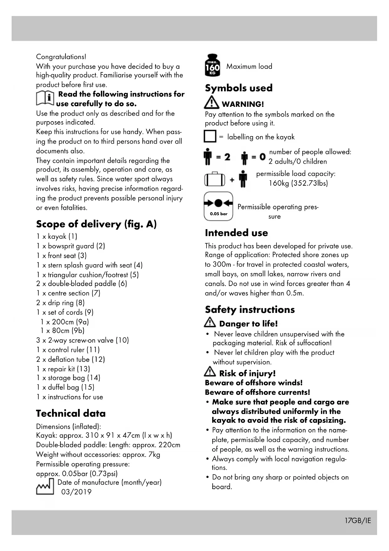 Maximum load Symbols used WARNING! Pay attention to the symbols marked on the product before using it. = labelling on the kayak number of people allowed: 2 adults/0 children permissible load capacity: 160kg (352.73lbs)