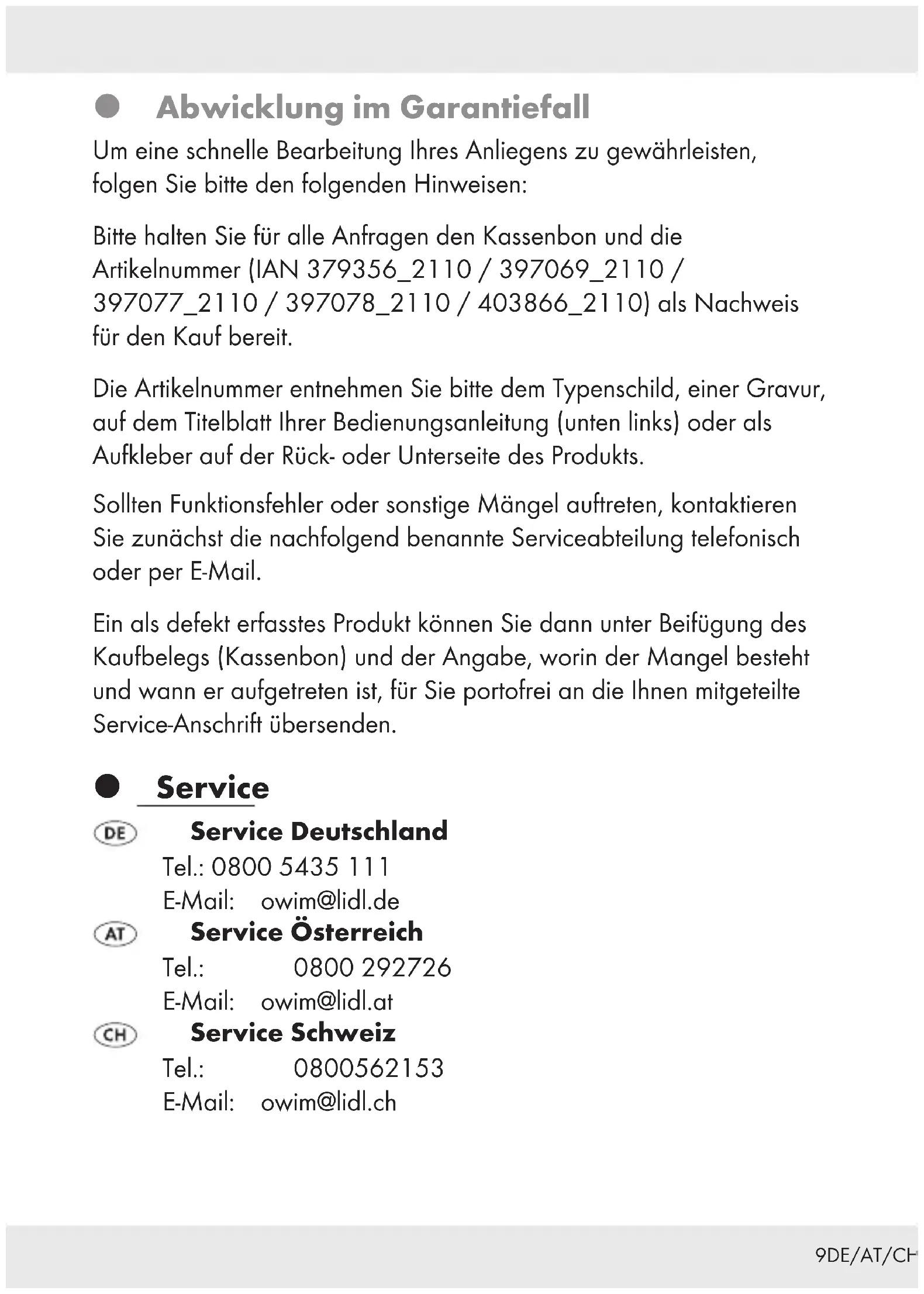 CAUTION! Please note that the enamel may be damaged if you drop or strike the product. Disposal The packaging is made entirely of recyclable materials, which you may dispose of at local recycling facilities. Contact your local refuse disposal authority for more details of how to dispose of your worn-out product. Warranty The product has been manufactured to strict quality guidelines and meticulously examined before delivery. In the event of product defects you have legal rights against the retailer of this product. Your legal rights are not limited in any way by our warranty detailed below. The warranty for this product is 3 years from the date of purchase. The warranty period begins on the date of purchase. Please keep the original sales receipt in a safe location. This document is required as your proof of purchase. Should this product show any fault in materials or manufacture within 3 years from the date of purchase, we will repair or replace it – at our choice – free of charge to you. This warranty becomes void if the product has been damaged, or used or maintained improperly.15GB/IE The warranty applies to defects in material or manufacture. This warranty does not cover product parts subject to normal wear, thus possibly considered consumables (e.g. batteries) or for damage to fragile parts, e.g. switches, rechargeable batteries or glass parts. Warranty claim procedure To ensure quick processing of your case, please observe the following instructions: Please have the till receipt and the item number (IAN 379356_2110 / 397069_2110 / 397077_2110 / 397078_2110 / 403866_2110) available as proof of purchase. You will find the item number on the rating plate, an engraving, on the front page of the instructions for use (bottom left), or as a sticker on the rear or bottom of the product. If functional or other defects occur, please contact the service department listed either by telephone or by e-mail. You can return a defective product to us free of charge to the service address that will be provided to you. Ensure that you enclose the proof of purchase (till receipt) and information about what the defect is and when it occurred. Service Service Great Britain Tel.: 08000569216 E-Mail: owim@lidl.co.uk Service Ireland Tel.: 1800 200736 E-Mail: owim@lidl.ie16 FR/BE