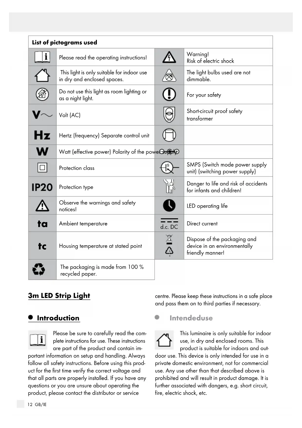 Dispose of the packaging and device in an environmentally friendly manner! The packaging is made from 100 % recycled paper. 3m LED Strip Light Introduction Please be sure to carefully read the com- plete instructions for use. These instructions are part of the product and contain im- portant information on setup and handling. Always follow all safety instructions. Before using this prod- uct for the first time verify the correct voltage and that all parts are properly installed. If you have any questions or you are unsure about operating the product, please contact the distributor or service centre. Please keep these instructions in a safe place and pass them on to third parties if necessary. Intended use This luminaire is only suitable for indoor use, in dry and enclosed rooms. This product is suitable for indoors and out- door use. This device is only intended for use in a private domestic environment, not for commercial use. Any use other than that described above is prohibited and will result in product damage. It is further associated with dangers, e.g. short circuit, fire, electric shock, etc.13 GB/IE Introduction / SafetyIntroduction Only for 14137100L: This is a specialist product, as the chromaticity co- ordinates lie outside the ranges stated in brackets. Chromaticity coordinates: (x<0.270 or x > 0.530); (y<-2.172 x² or y >-2.3172 x² + 2.3653 x -0.1595) Only for 14137100L: This product is a decorative light. Do not use this as room lighting or as a night light. Scope of delivery Check immediately after unpacking that the parts are complete and that the product is in proper condition. 1 LED Strip Light 2 connectors 4 end caps 2 cable holder 1 adhesive strip 1 set of instructions for use Parts description