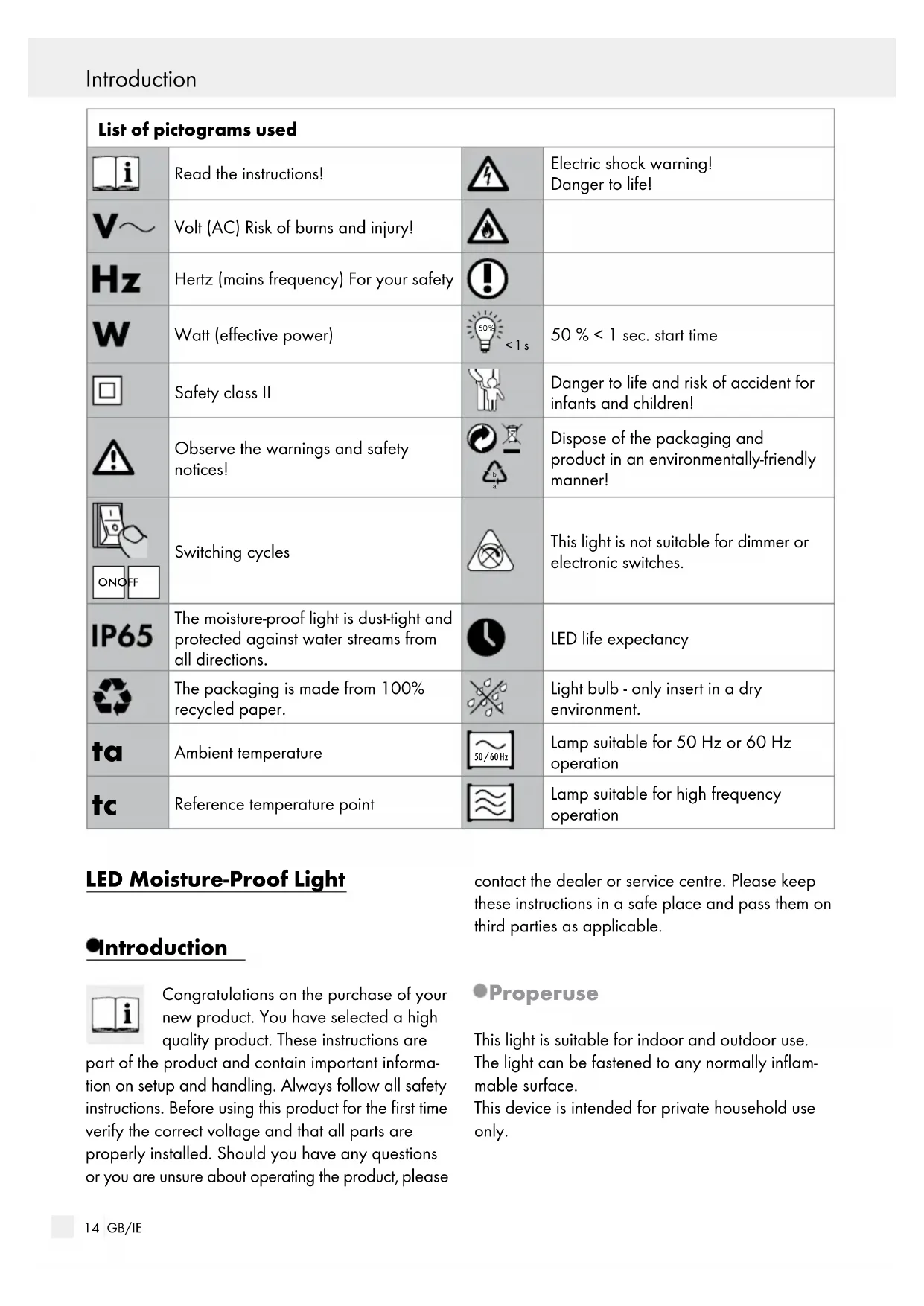 Reference temperature point Lamp suitable for high frequency operation LED Moisture-Proof Light Introduction Congratulations on the purchase of your new product. You have selected a high quality product. These instructions are part of the product and contain important informa- tion on setup and handling. Always follow all safety instructions. Before using this product for the first time verify the correct voltage and that all parts are properly installed. Should you have any questions or you are unsure about operating the product, please contact the dealer or service centre. Please keep these instructions in a safe place and pass them on third parties as applicable. Proper use This light is suitable for indoor and outdoor use. The light can be fastened to any normally inflam- mable surface. This device is intended for private household use only. Introduction / Safety15 GB/IE Introduction Introduction / Safety Delivery contents (Fig. A) 1 LED moisture-proof light 14143704L 1 LED light bulb, LED, T8, G13, max. 18 W 12 Locking clamps 2 Mounting clamps 4 Wall plugs 4 Screws 1 Set of assembly instructions and instructions for use Parts description